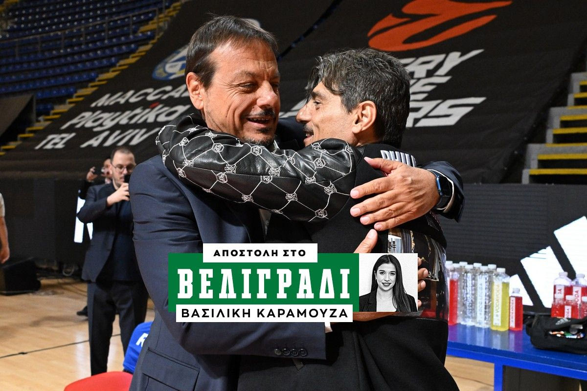 Ο Δημήτρης Γιαννακόπουλος αγκαλιάστηκε με τον Εργκίν Αταμάν πριν το τζάμπολ του αγώνα του Παναθηναϊκού AKTOR με τη Μακάμπι Τελ Αβίβ στο Βελιγράδι.