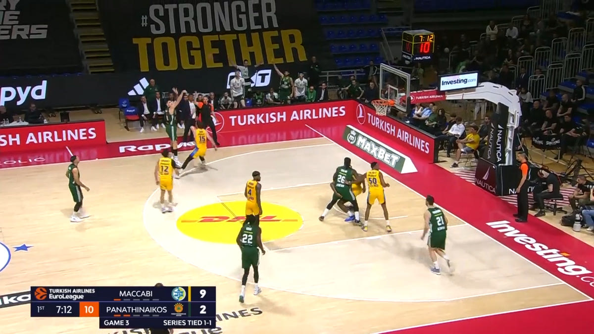 Πριν από το Game 3 της σειράς ο Τζον ΝτιΜπαρτολομέο είχε δηλώσει πως η Μακάμπι έπρεπε να βρει τρόπο να περιορίσει τον Κώστα Σλούκα παίζοντας καλύτερη ομαδική άμυνα. Ο διεθνής γκαρντ είχε πάρει στις πλάτες του τον Παναθηναϊκό AKTOR στα δύο πρώτα παιχνίδια, με την Μακάμπι να αποφασίζει ότι για να τον σταματήσει έπρεπε απλώς να πάρει την μπάλα από τα χέρια του, ρισκάροντας να χάσει από τους άλλους παίκτες των “πράσινων”. Φρόντισε μάλιστα να του δείξει από την πρώτη φάση του αγώνα ότι δεν σκοπεύει να του δώσει την ευκαιρία να βρει ρυθμό μέσα από σουτ, παρά θα τον μετέτρεπε σε πασέρ. Ιδού: