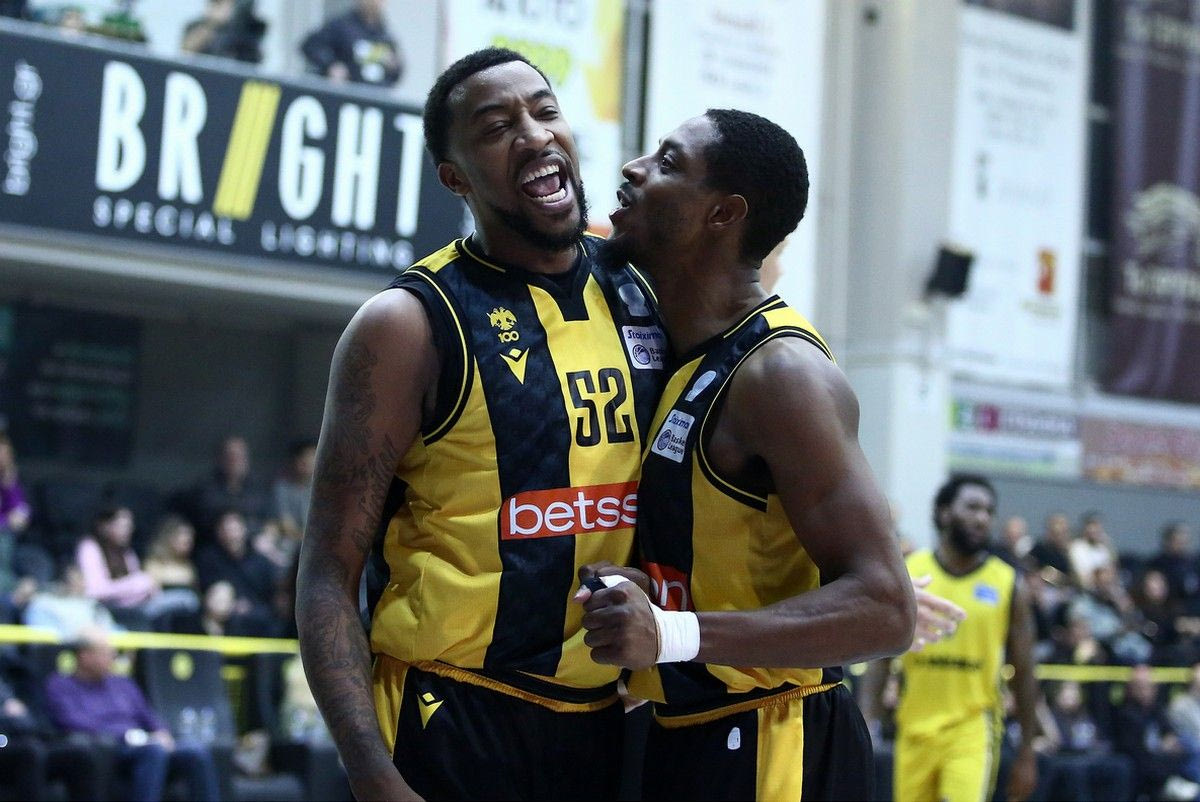 Οι ΜακΡέι και Νάιτ πανηγυρίζουν εύστοχο καλάθι της ΑΕΚ στην αναμέτρηση απέναντι στο Μαρούσι INTIME SPORTS