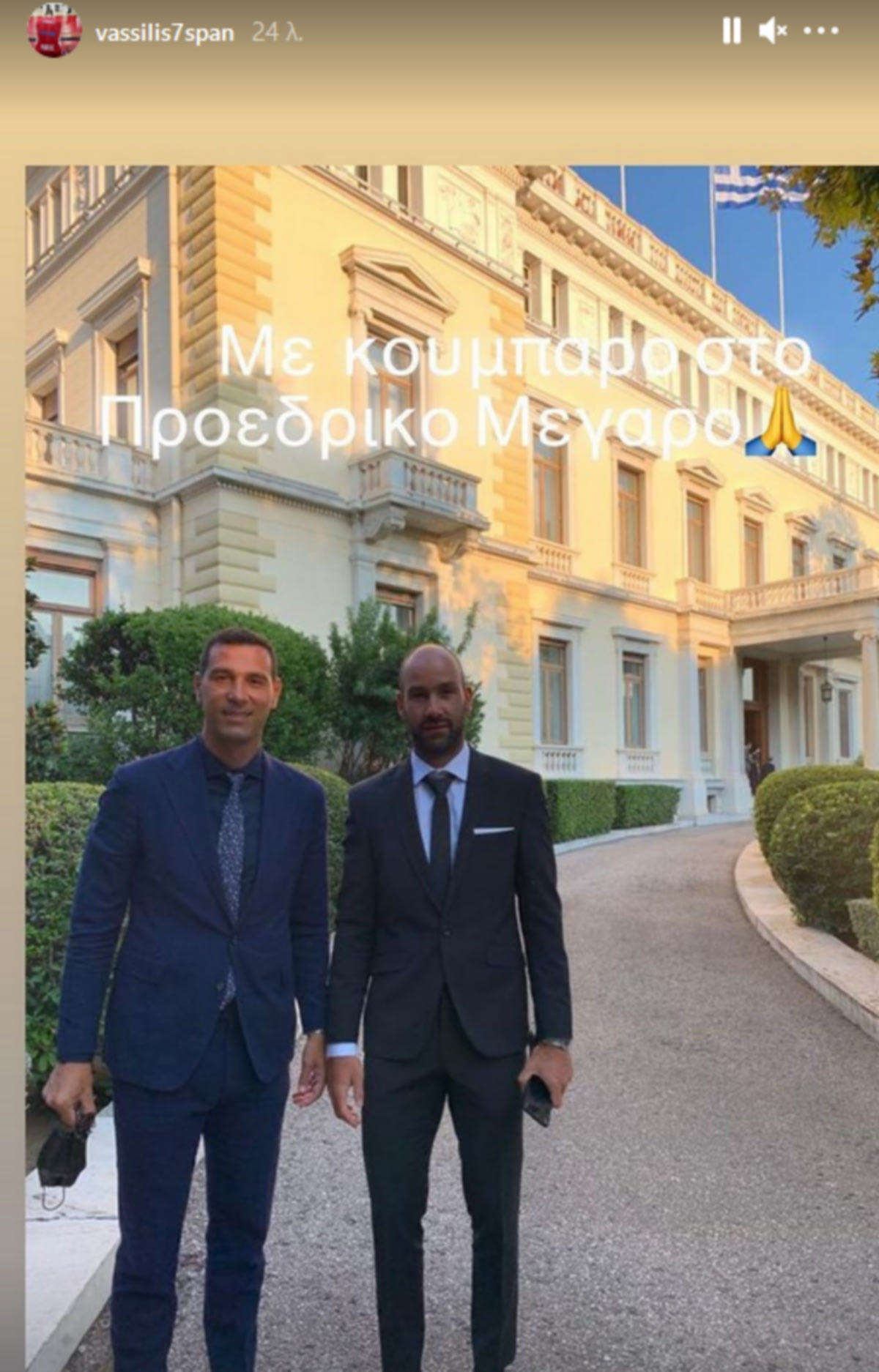 Οι δύο φίλοι, κουμπάροι και -μ’ ελάχιστες ημέρες διαφορά- παλαίμαχοι παίκτες του μπάσκετ ντύθηκαν ανάλογα για την περίσταση και μετάβησαν παρέα στο Προεδρικό Μέγαρο προκειμένου να παραστούν στη δεξίωση που οργάνωσε το Σάββατο 24 Ιουλίου η ΠτΔ, Κατερίνα Σακελλαροπούλου. Αμφότεροι απόλαυσαν την κοινή παρουσία τους στην ετήσια εκδήλωση που εφέτος έλαβε χώρα στον Κήπο του Μεγάρου και έβγαλαν αναμνηστικές φωτογραφίες που μοίρασαν στα μέσα κοινωνικής δικτύωσης.