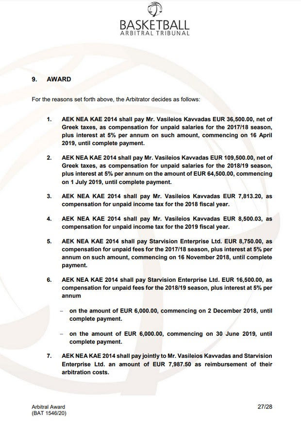 Ποσό μεγαλύτερο των 200.000 ευρώ επιδίκασε το BAT στον Βασίλη Καββαδά, με την ΑΕΚ να έχει πλέον τρία ban μεταγραφών.