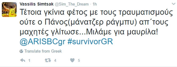 Η νέα ατυχία που “χτύπησε” τον Άρη αποτέλεσε μια καλή αφορμή για τον Βασίλη Σίμτσακ, προκειμένου να παραλληλίσει την ομάδα του με τον… μάνατζερ ράγκμπι του Survivor. ” Τέτοια γκίνια φέτος με τους τραυματισμούς, ούτε ο Πάνος (μάνατζερ ράγκμπι) από τους μαχητές γλίτωσε. Μιλάμε για μαυρίλα!“, έγραψε χαρακτηριστικά διακωμωδώντας την κατάσταση που επικρατεί στον Άρη από την αρχή της αγωνιστικής περιόδου.