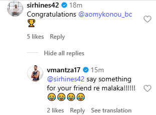 H Μύκονος στέφθηκε πρωταθλήτρια της Elite League, αφού επικράτησε της Μεγαρίδας με 86-76. Μετά το τέλος του αγώνα, λοιπόν, ο σύλλογος ανέβασε βίντεο από τους πανηγυρισμούς των πρωταγωνιστών, στα μέσα κοινωνικής δικτύωσής του. Το εν λόγω βίντεο σχολίασε στο Instagram και ο πάλαι ποτέ αστέρας του Ολυμπιακού, Κάιλ Χάινς, ο οποίος συνεχάρη τον κυκλαδίτικο σύλλογο. Στο σχόλιό του απάντησε και ο Βαγγέλης Μάντζαρης, ο οποίος του έγραψε: “Πες κάτι και για τον φίλο σου ρε μα@@@κα”