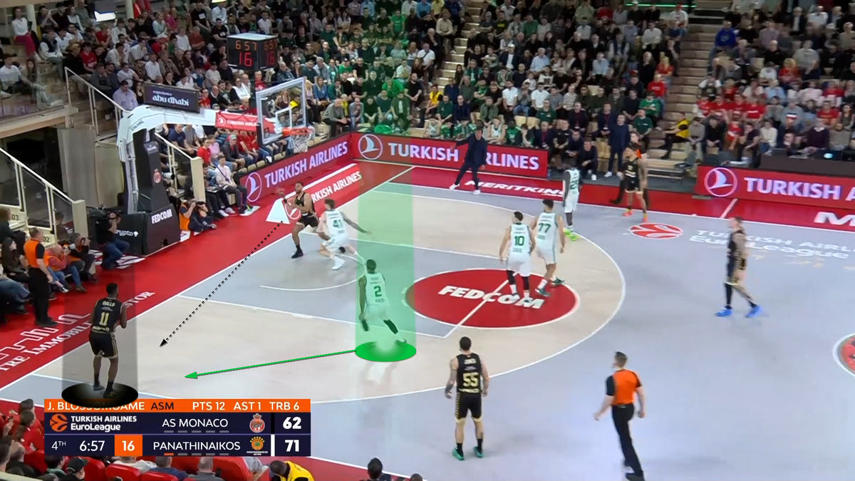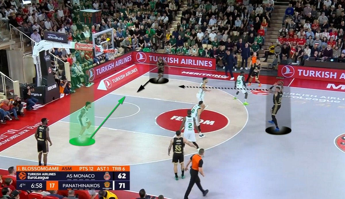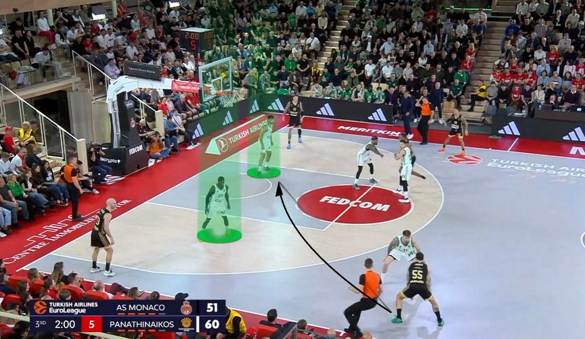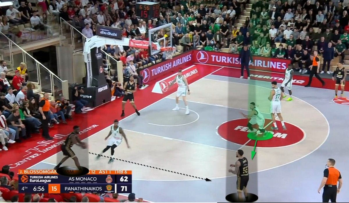 Αυτή είναι μία σχεδόν τέλεια άμυνα για τον Παναθηναϊκό AKTOR. Η περιστροφή είναι άρτια (και η επίθεση της Μονακό λίγο βιαστική). Τίποτα από αυτά όμως δεν θα ήταν δυνατόν να συμβούν αν νωρίτερα ο Χουάντσο – ένας από τους κορυφαίους παίκτες στην Ευρώπη στην άμυνα από την αδύνατη πλευρά – δεν έτρεχε από την μία πλερά στην άλλη για να καλύψει τον Οκόμπο.