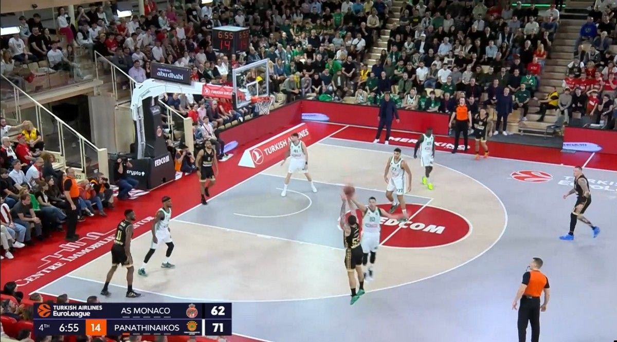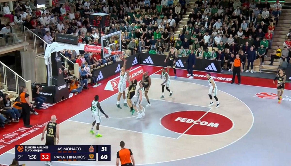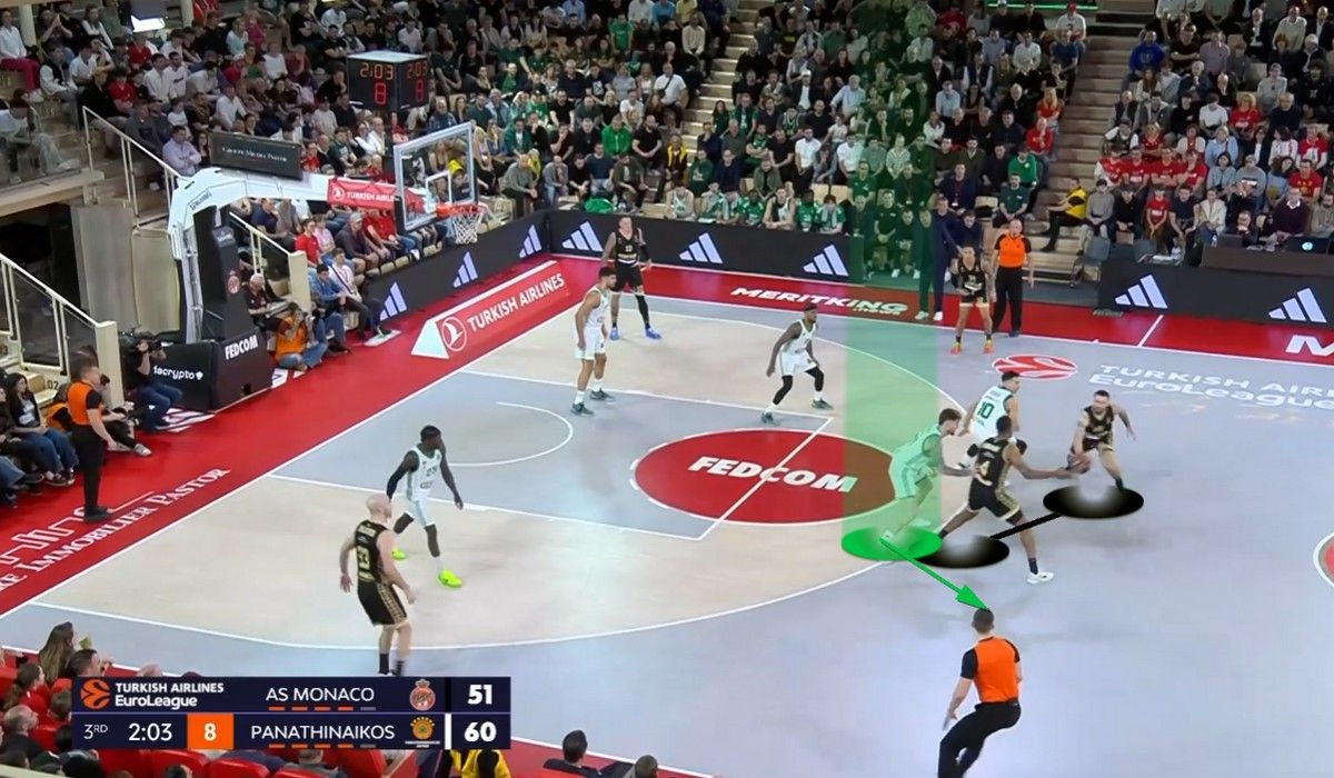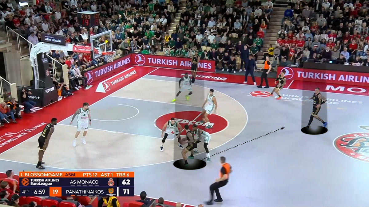Αυτή είναι μία σχεδόν τέλεια άμυνα για τον Παναθηναϊκό AKTOR. Η περιστροφή είναι άρτια (και η επίθεση της Μονακό λίγο βιαστική). Τίποτα από αυτά όμως δεν θα ήταν δυνατόν να συμβούν αν νωρίτερα ο Χουάντσο – ένας από τους κορυφαίους παίκτες στην Ευρώπη στην άμυνα από την αδύνατη πλευρά – δεν έτρεχε από την μία πλερά στην άλλη για να καλύψει τον Οκόμπο.