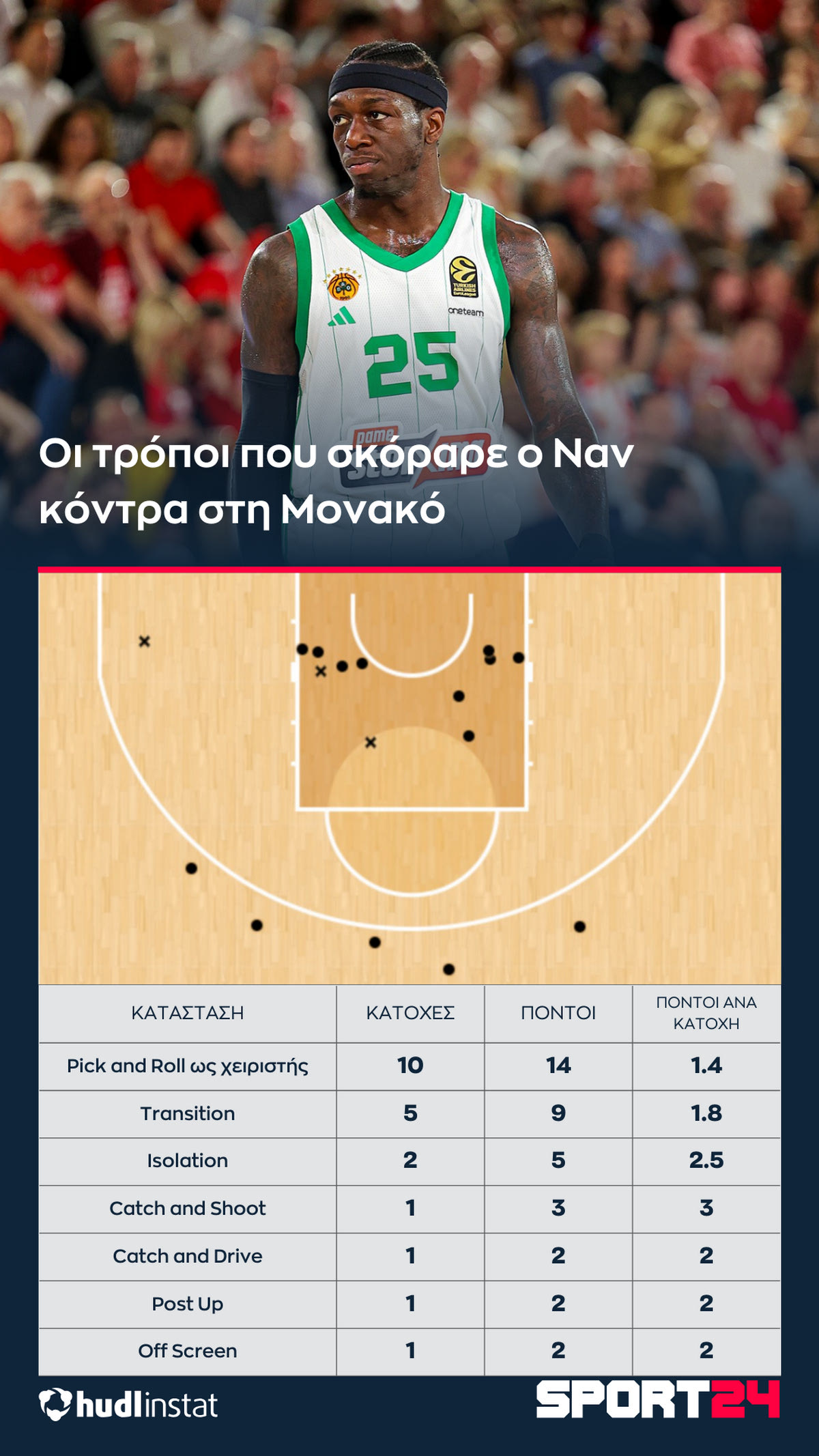 *Με κυκλάκι τα εύστοχα σουτ, με “x” τα άστοχαΟ Ναν πήρε την κατάσταση πάνω του από την αρχή, σημειώνοντας 18 πόντους στο πρώτο μέρος. Δεν έμεινε όμως εκεί. Στην τρίτη περίοδο, με την Μονακό να μειώνει στον 1 πόντο χάρη στο σερί 16-0 που έτρεξε, απάντησε με προσωπικά καλάθια. Συνολικά ο Ναν ήταν υπεύθυνος – άμεσα ή έμμεσα – για 14 από τους 16 πόντους της ομάδας του στην τρίτη περίοδο, αφού είχε 12 πόντους και 1 ασίστ (σε ένα κάρφωμα του Γιούρτσεβεν) σε αυτό το διάστημα.
