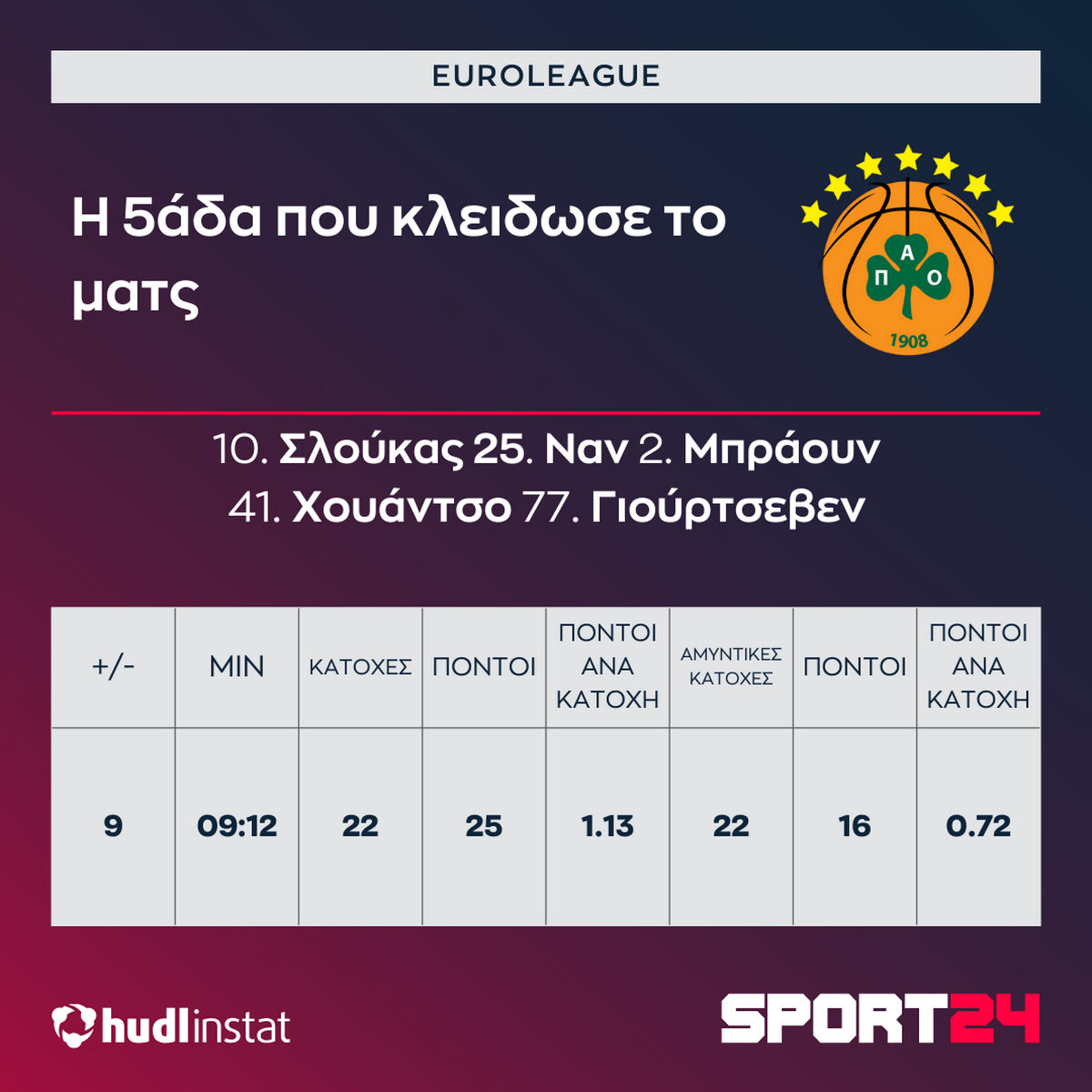 Σύμφωνα με το Hudl Instat, ο Παναθηναϊκός AKTOR δεχόταν 0.9 πόντους ανά κατοχή στο ματς με την Μονακό. Στα 27 λεπτά που βρέθηκε όμως στο παρκέ ο Χουάντσο, αυτό το νούμερο έπεφτε στους 0.74 πόντους ανά κατοχή. Η επιρροή του στο ματς ήταν σαφής. Κι ας μην σκόραρε όσο σε άλλα παιχνίδια.