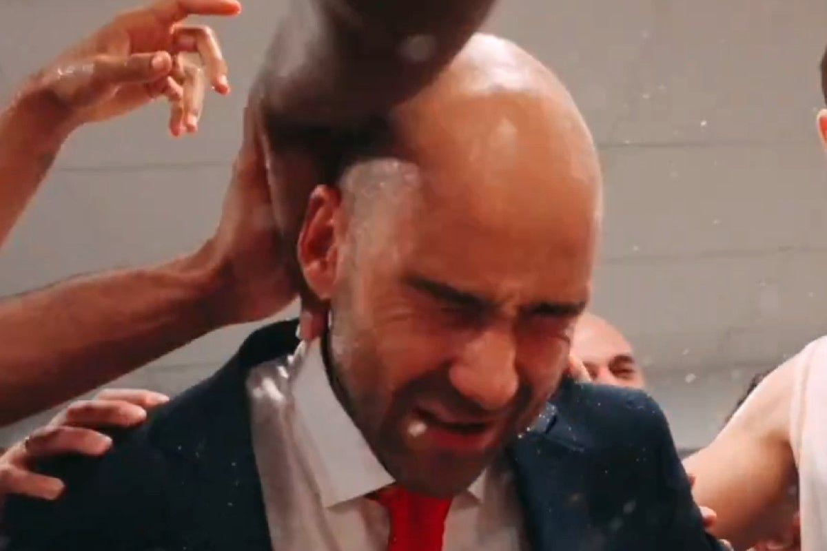 Ο Έλληνας τεχνικός δέχθηκε το μπουγέλο από τους παίκτες του στα αποδυτήρια, μετά το τέλος του ματς, ενώ έκανε μία ομιλία, τονίζοντας πως η ομάδα του πρέπει να παραμείνει ταπεινή.