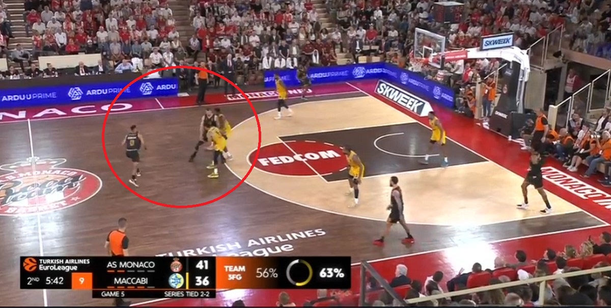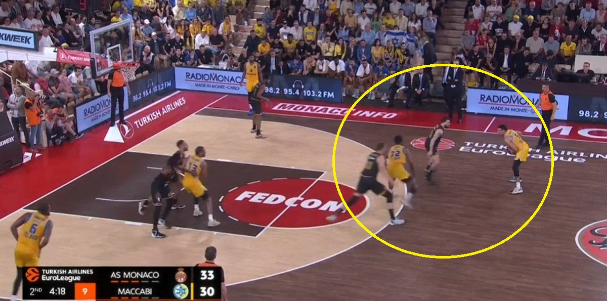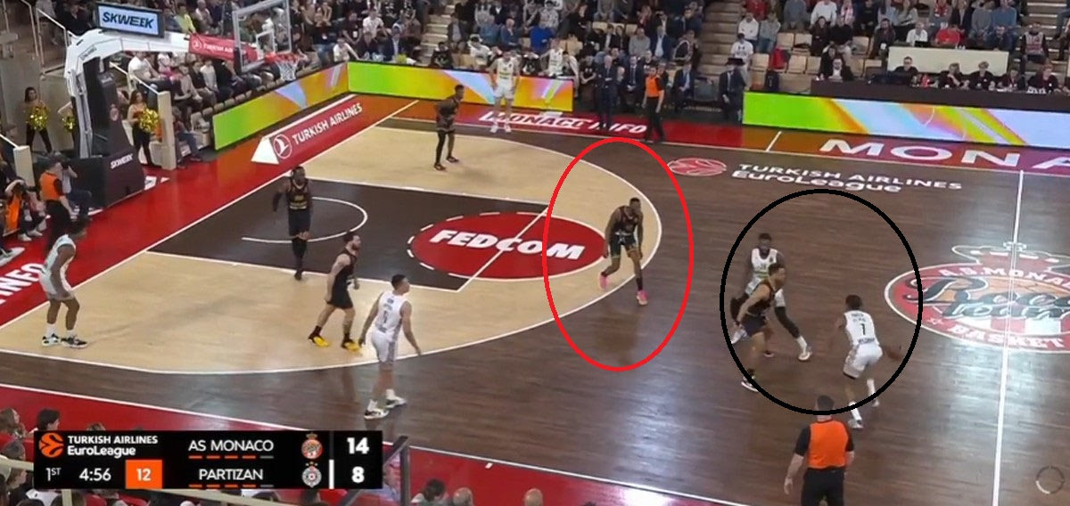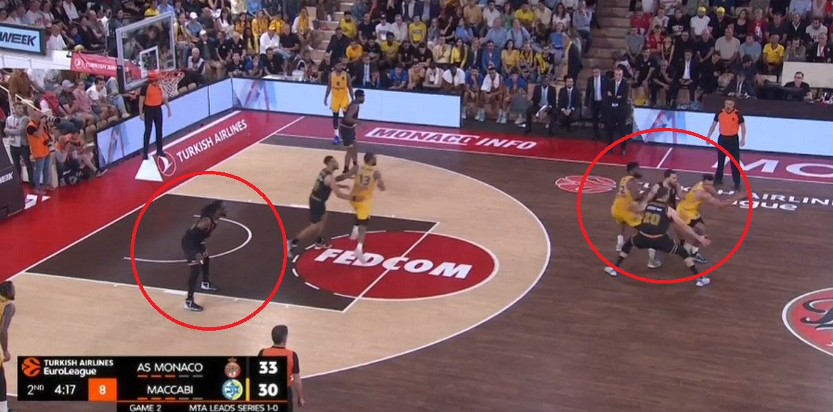 Η Μονακό έχει κρατήσει τα πράγματα απλά στην επίθεσή της. Η τριάδα των ταλαντούχων γκαρντ της έχει τον απόλυτο έλεγχο, και μπορεί είτε να δημιουργήσει σε κατάσταση ένας εναντίον ενός, είτε μέσα από Pick and Roll. Ιδού ακόμα ένα παράδειγμα: