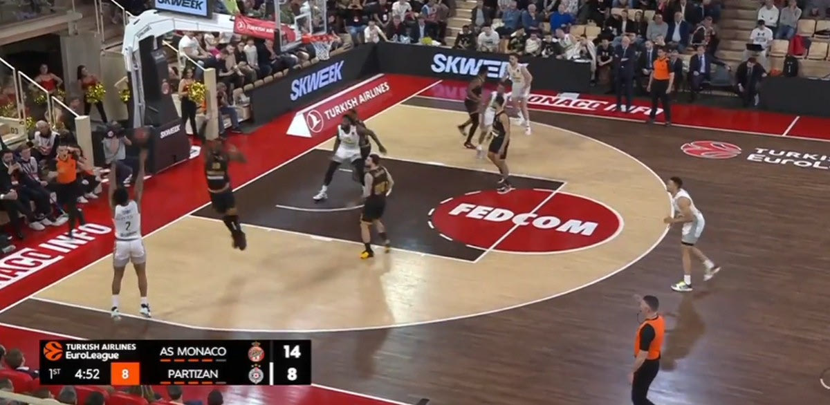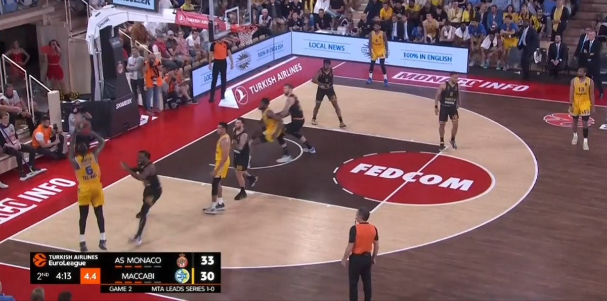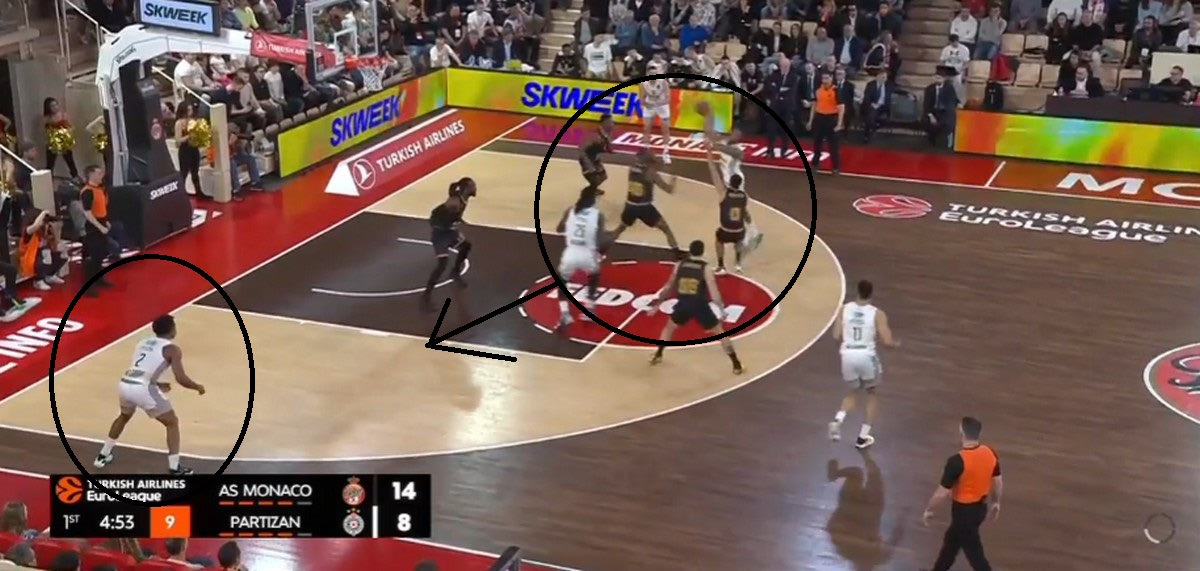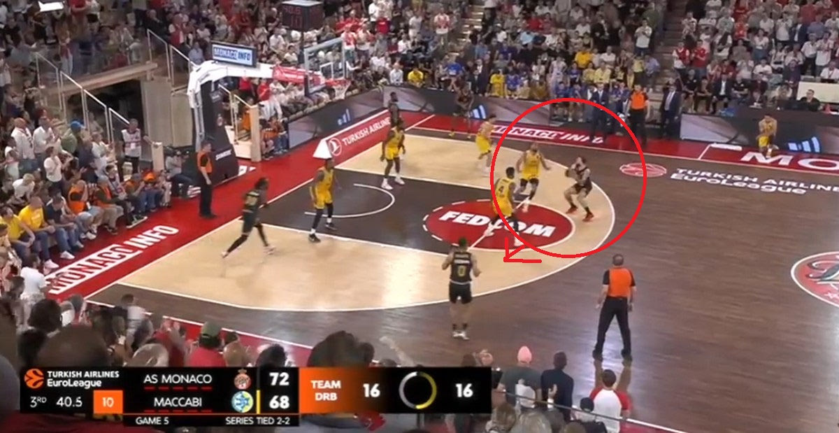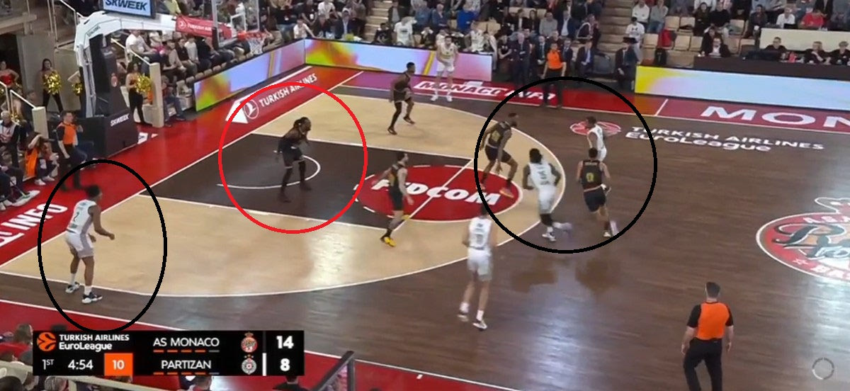 Η Μονακό έχει κρατήσει τα πράγματα απλά στην επίθεσή της. Η τριάδα των ταλαντούχων γκαρντ της έχει τον απόλυτο έλεγχο, και μπορεί είτε να δημιουργήσει σε κατάσταση ένας εναντίον ενός, είτε μέσα από Pick and Roll. Ιδού ακόμα ένα παράδειγμα: