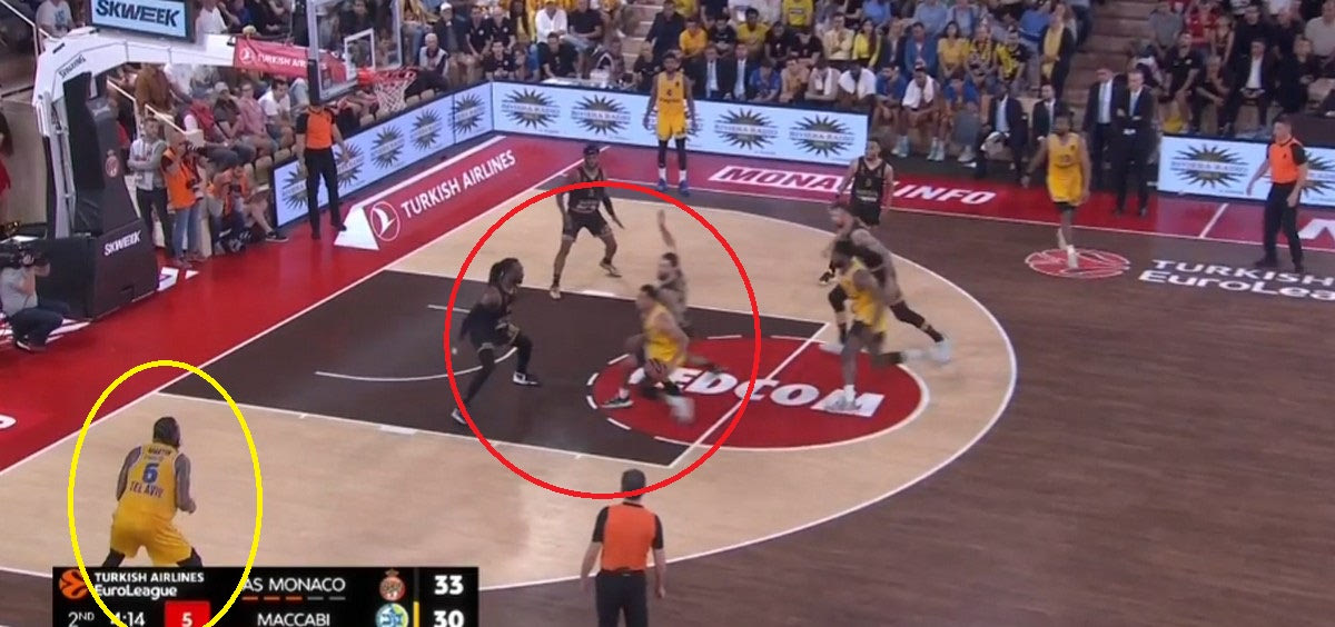 Η Μονακό ξεκινάει σχεδόν όλες τις επιθέσεις της στην λογική του Pick and Roll. Οι Γάλλοι δεν έχουν κανένα πρόβλημα να εκτελέσουν σε πρώτο χρόνο, ακόμα δηλαδή και στα πρώτα δευτερόλεπτα μίας επίθεσης, αρκεί να βρουν ένα ελεύθερο σουτ. Ιδού ένα παράδειγμα από την σειρά με την Μακάμπι: