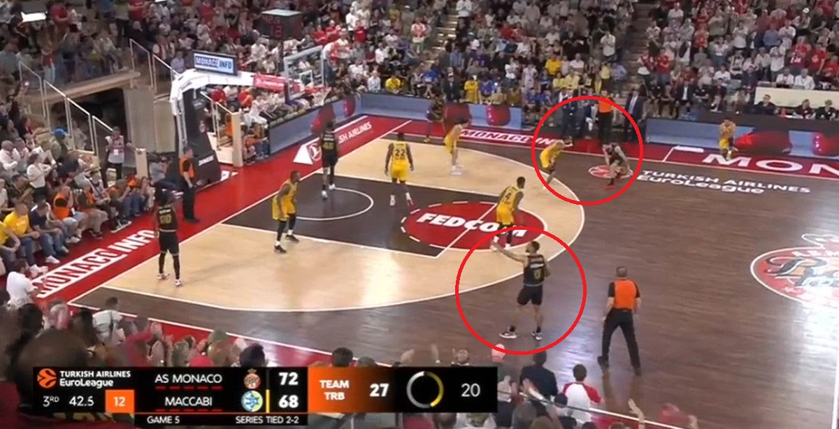 Ο Οκομπό στήνει Pick and Roll με τον Μοτιεγιούνας, με την Μακάμπι να επιλέξει να κάνει αλλαγή.
