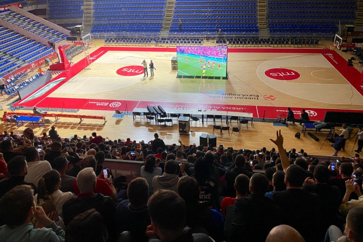Οι φίλοι του Ερυθρού Αστέρα παρέμειναν στη Χάλα Πιονίρ μετά το τέλος του αγώνα της EuroLeague κόντρα στη Μακάμπι, για να δουν την Εθνική Σερβίας να αγωνίζεται κόντρα στη Βραζιλία στο Μουντιάλ 2022.