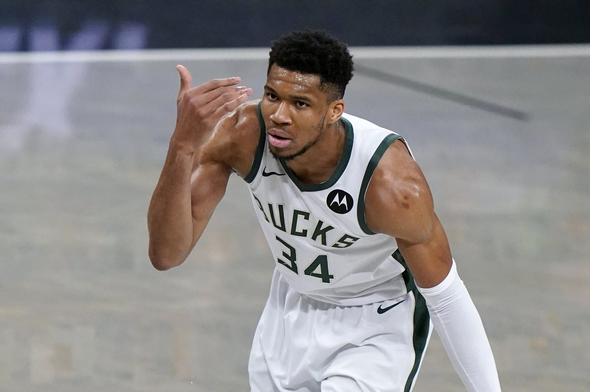 Ο Γιάννης Αντετοκούνμπο ζητάει σκριν από συμπαίκτη του σε αγώνα Νετς - Μπακς για την ημιτελική σειρά των playoffs 2020/21 2021 AP Photo/Kathy Willens