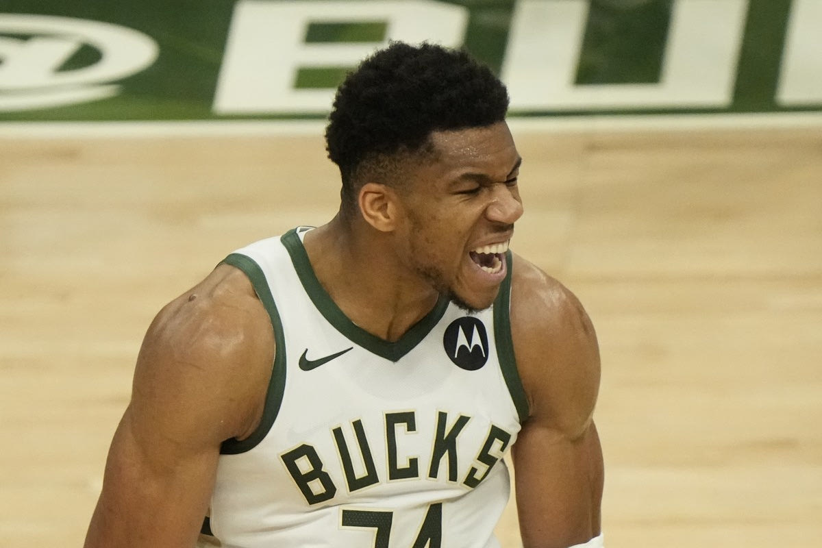 Ο Γιάννης Αντετοκούνμπο πανηγυρίζει στο Game 4 της σειράς Νετς - Μπακς (13/6/2021) 2021 AP Photo/Morry Gash