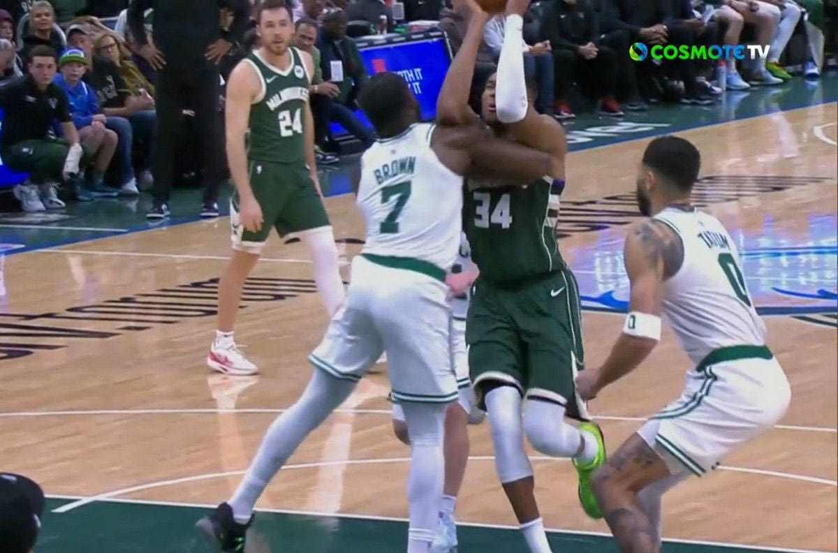 Στα πρώτα λεπτά της τέταρτης περιόδου του αγώνα των Μπακς με τους Σέλτικς, ο Τζέιλεν Μπράουν έκανε σκλήρο και αντιαθλητικό φάουλ στον Γιάννη Αντετοκούνμπο.