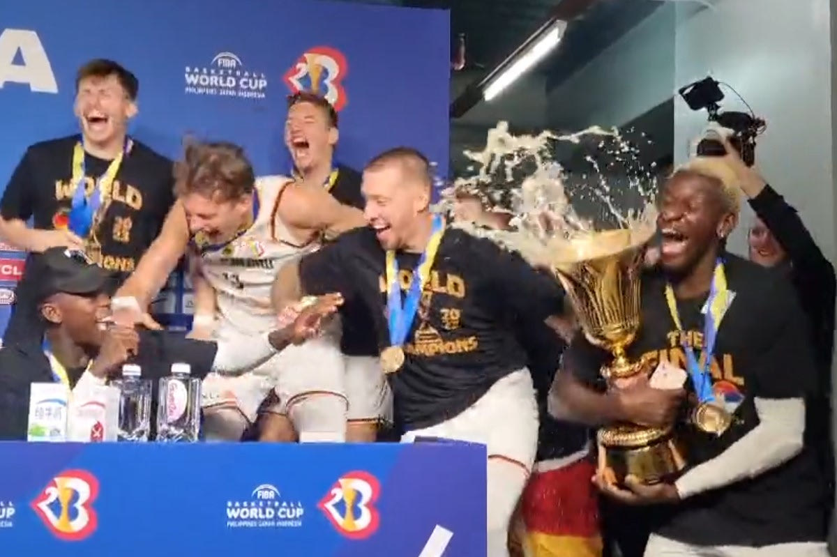 MundoBasket 2023, Γερμανία: Οι ξέφρενοι πανηγυρισμοί στην συνέντευξη Τύπου με το τρόπαιο γεμάτο από σαμπάνια