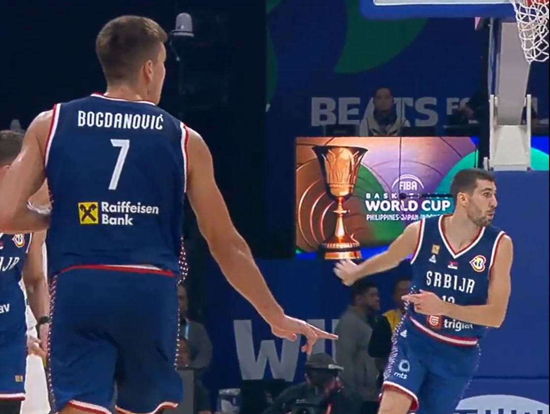 Ο καυτός Μπόγκνταν Μπογκντάνοβιτς έβαλε 18 πόντους στο πρώτο μέρος του αγώνα της Σερβίας με τη Λιθουανία και έδειξε το "too small" στον Ρόκας Γιοκουμπάιτις μετά από τρίποντο από την κορυφή της ρακέτας.