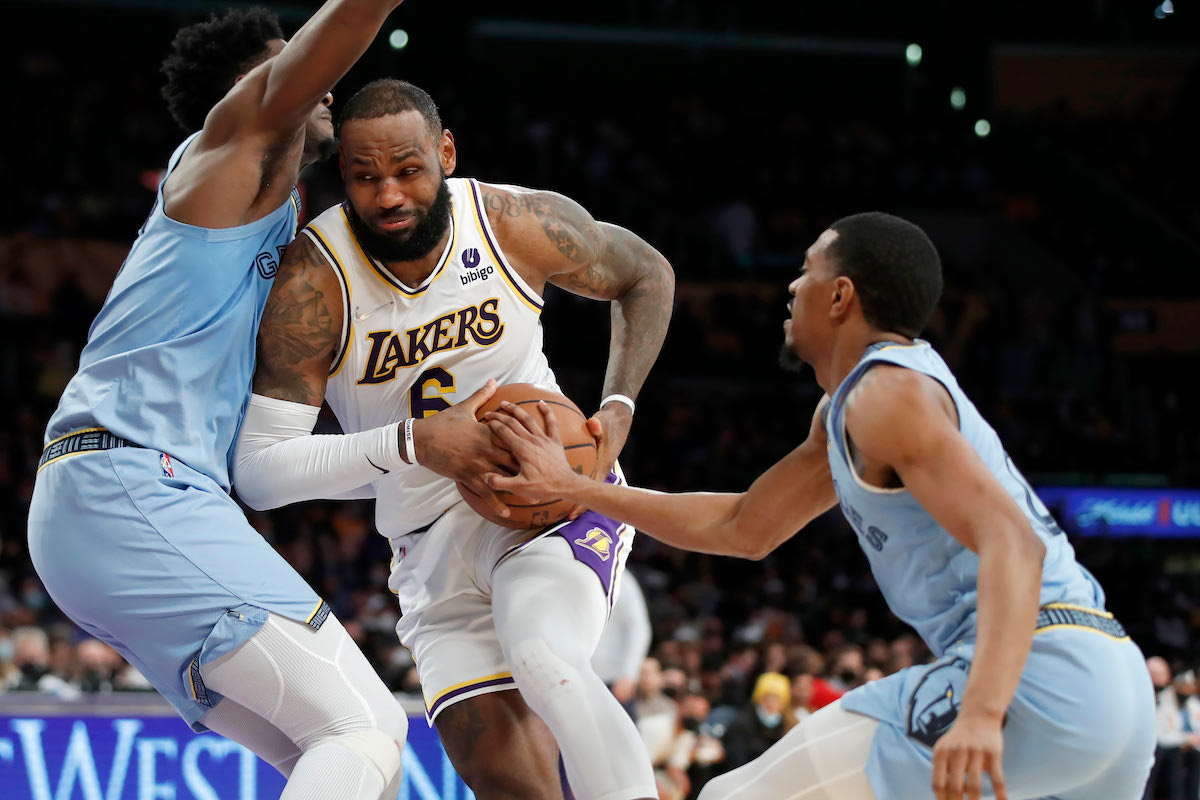 Los Angeles Lakers forward LeBron James, center, collides with Memphis Grizzlies forward Jaren Jackson Jr., left, as guard De'Anthony Melton, right, reaches for the ball during the second half of an NBA basketball game, Sunday, Jan. 9, 2022, in Los Angeles. (AP Photo/Alex Gallardo) 2022 AP Photo/Alex Gallardo