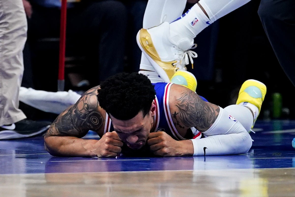 Philadelphia 76ers' Danny Green lays injured on the ground during the first half of Game 6 of an NBA basketball second-round playoff series against the Miami Heat, Thursday, May 12, 2022, in Philadelphia. (AP Photo/Matt Slocum) © 2022 Matt Slocum / AP Images