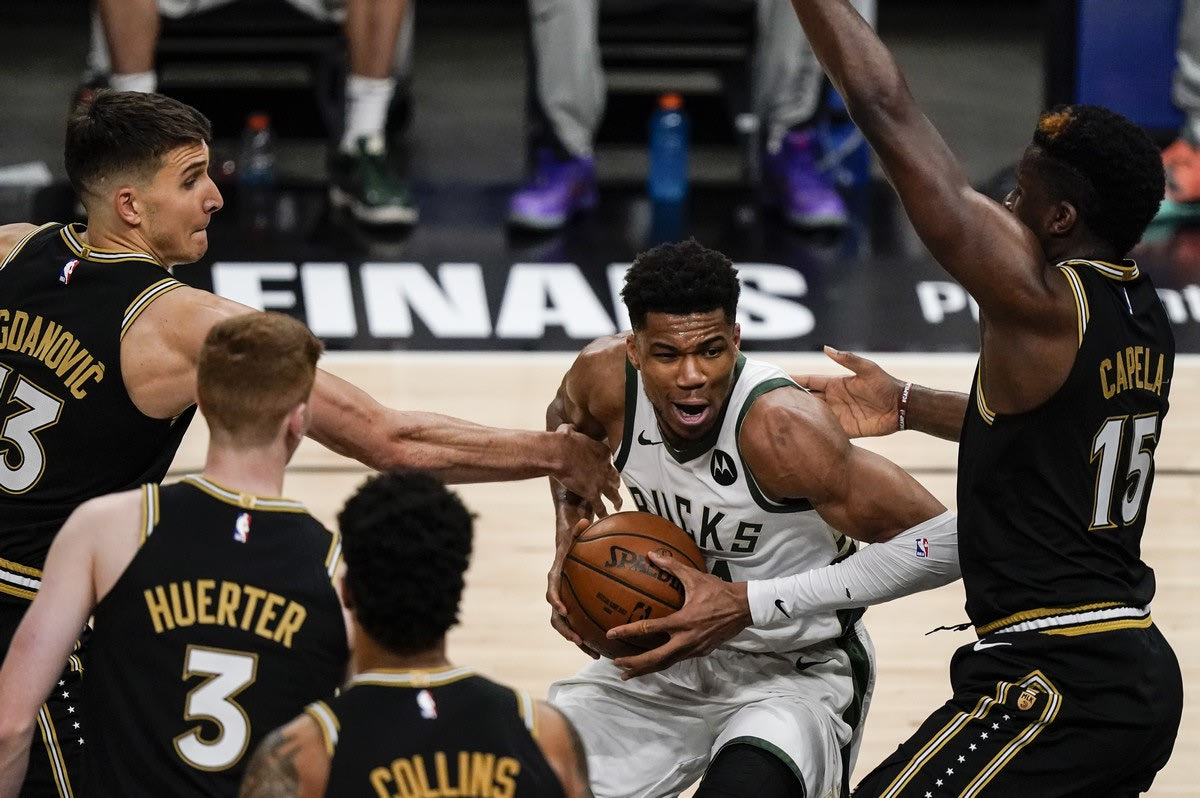 Ο Γιάννης Αντετοκούνμπο σε μια θάλασσα από παίκτες των Ατλάντα Χοκς στο Game 4 των τελικών της Ανατολής 2021 AP Photo/Brynn Anderson