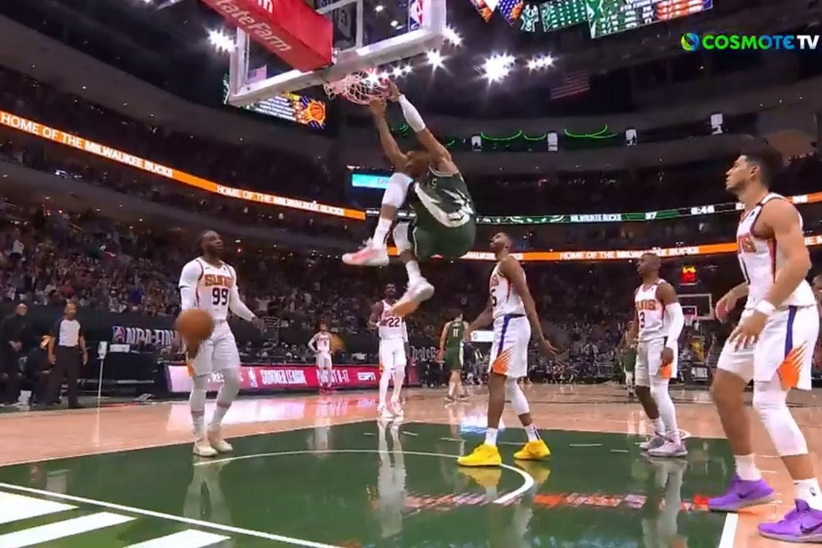 Οδοστρωτήρας ο Γιάννης Αντετοκούνμπο, βρήκε χώρο σε μία φάση στην 2η περίοδο του Game 3 των ΝΒΑ Finals ανάμεσα στους Σανς και τους Μπακς και κάρφωσε με μανία στο καλάθι.