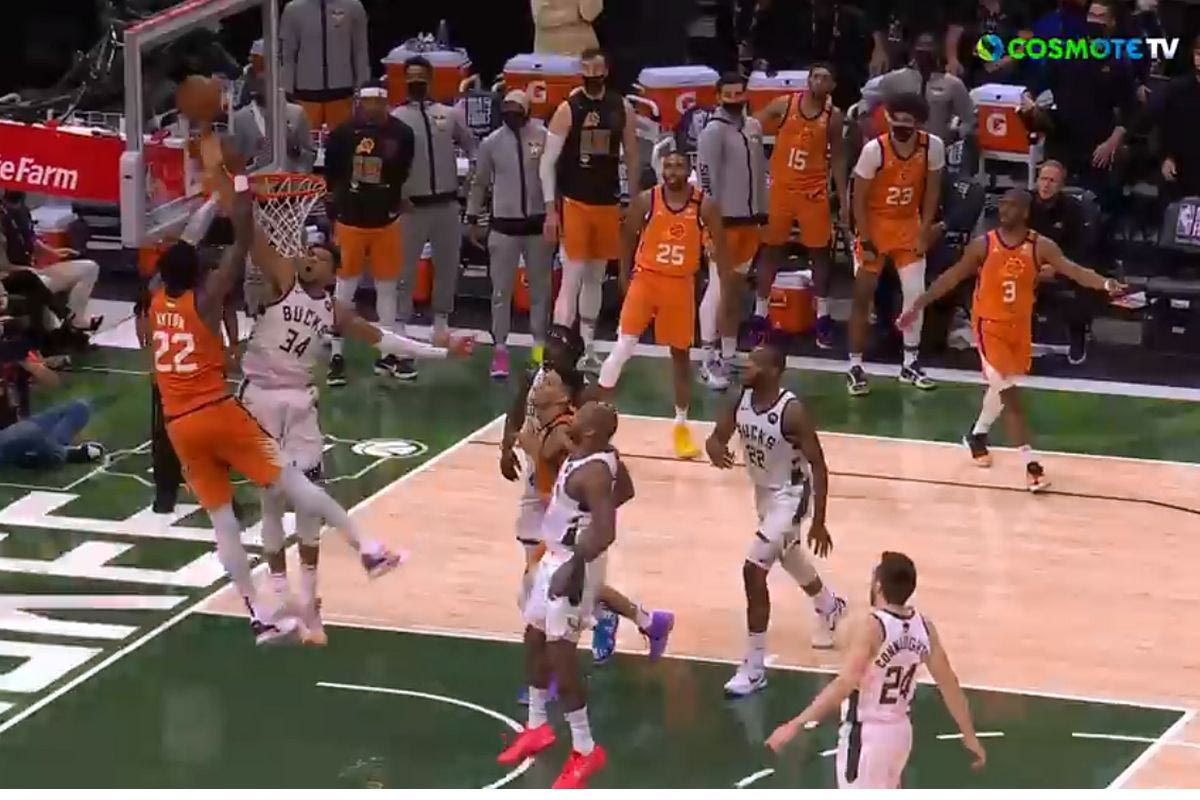 Ήταν το highlight του Game 4 ανάμεσα στους Μπακς και τους Σανς. Η τάπα του Γιάννη Αντετοκούνμπο στον ΝτιΆντρε Έιτον βρέθηκε δίκαια στην κορυφή του Top-5 του ΝΒΑ.