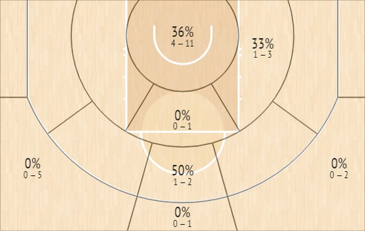 Το Shot Chart του 27χρονου σέντερ όσο τον μαρκάρει ο Ντρέιμοντ Γκριν καταδεικνύει το μέγεθος του προβλήματός του. Μαζί, εξηγεί πολλά για το γεγονός πως οι Ντένβερ Νάγκετς είναι κομπάρσοι στη σειρά ως τώρα. Για του λόγου το αληθές υπάρχει κι η εικόνα, που είναι αδιάψευστος μάρτυρας όλων αυτών.