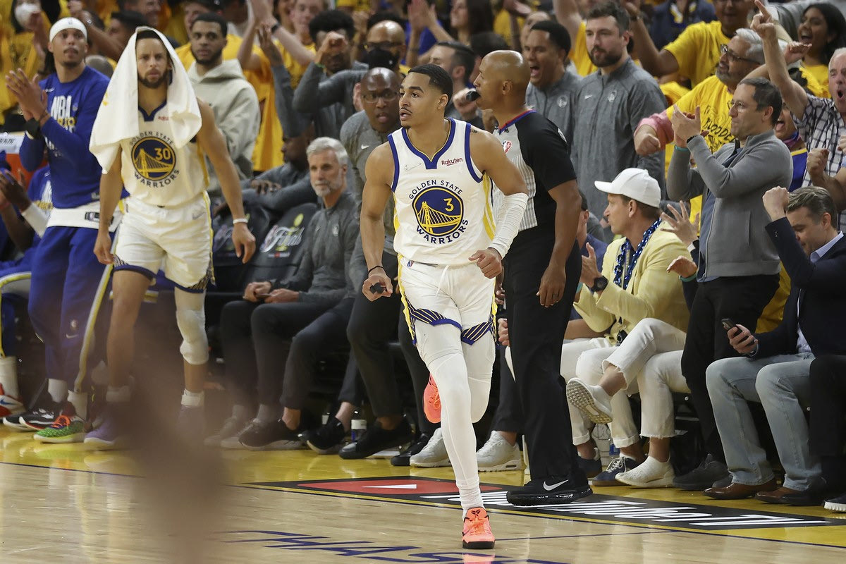 Golden State Warriors guard Jordan Poole (3) runs up the court after scoring against the Boston Celtics during the second half of Game 5 of basketball's NBA Finals in San Francisco, Monday, June 13, 2022. (AP Photo/Jed Jacobsohn) © 2022 Jed Jacobsohn / AP Images