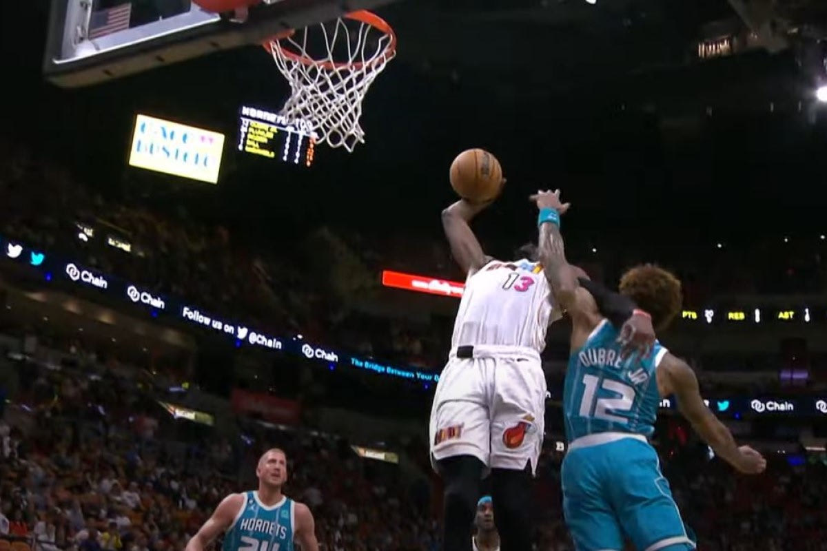 Ο Κέλι Ούμπρε βρέθηκε εκτός θέσης στην άμυνα και προσπάθησε -μάταια- να σταματήσει τον Μπαμ Αντεμπάγιο. Ωστόσο, ο 25χρονος ψηλός των Χιτ βρήκε κενό διάδρομο και δεν δυσκολεύτηκε ιδιαίτερα να καρφώσει την μπάλα, παρότι είδε ξαφνικά το χέρι του παίκτη των Χόρνετς στο πρόσωπό του.