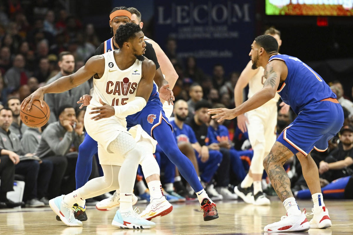 Cleveland Cavaliers guard Donovan Mitchell (45) passes against New York Knicks forwards Cam Reddish (0) and Obi Toppin (1) during the second half of an NBA basketball game, Sunday, Oct. 30, 2022, in Cleveland. (AP Photo/Nick Cammett) © 2022 Nick Cammett / AP Images
