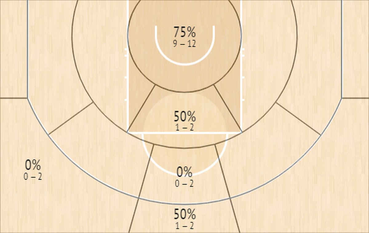 Ο τρόπος που έκανε – άμεσα – ζημιά ο Γιόκιτς δείχνει την κυριαρχία του κοντά στο καλάθι. Αυτό που δείχνει όμως ακόμα περισσότερα είναι το ιδιαίτερο Shot Chart του, αφού φαίνεται ότι 18 από τις 20 επιθέσεις που εκδήλωσε ήρθαν από τον κεντρικό διάδρομο και μόλις 2 αριστερά από τις 45 μοίρες! Κοινώς, ο Γιόκιτς έκανε σαφές ότι θα έκανε όλη την ζημιά του στους Τζαζ παίζοντας, ή καταλήγοντας, στον κεντρικό διάδρομο. Ιδού και το Shot Chart του: