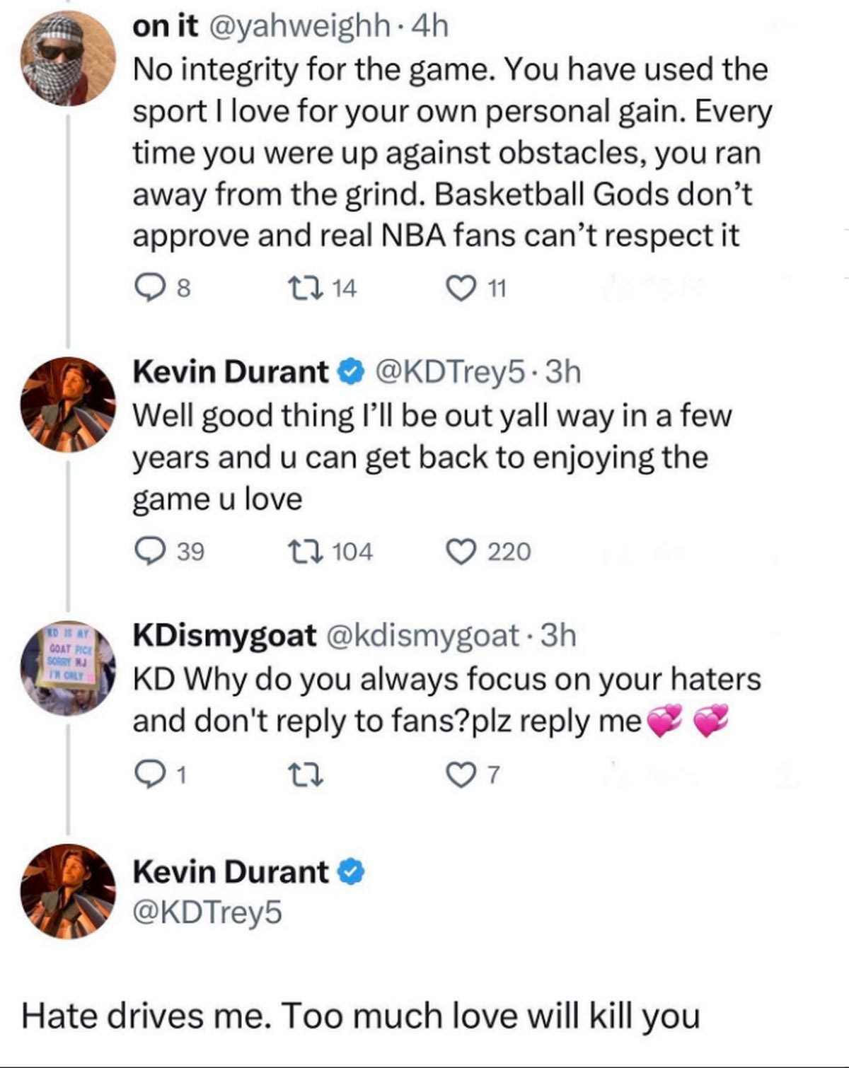 Τότε ήταν που ένας θαυμαστής του All Star φόργουορντ τον ρώτησε: “KD γιατί πάντα εστιάζεις στους haters και δεν απαντάς στους θαυμαστές σου; Απάντα μου σε παρακαλώ”. Με τον Ντουράντ να απαντάει: “Το μίσος με οδηγεί. Η πολλή αγάπη θα σε σκοτώσει”.