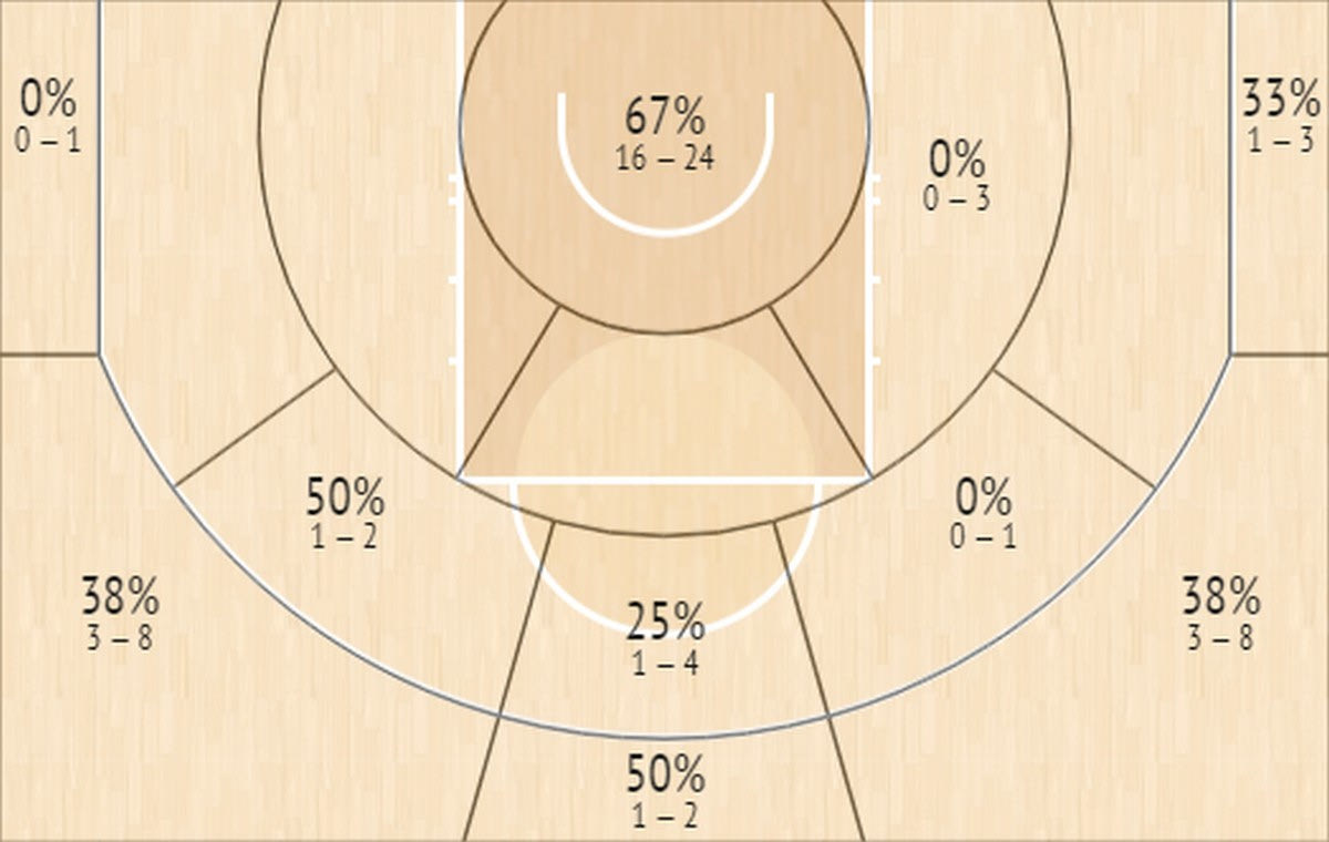 Κοινώς χρειάστηκε να εστιάσει στο κομμάτι του παιχνιδιού του που ξέρει ότι πρέπει να δουλέψει για να σταθεί στο υψηλότερο επίπεδο. Και η αλήθεια είναι ότι έδειξε καλά σημάδια. Τα συνολικά 8/22 τρίποντα του Καλαϊτζάκη που μεταφράζονται σε ποσοστό 36.4% είναι ένα οριακά καλό νούμερο. Το ενθαρρυντικό όμως για αυτόν ήταν ότι είχε 6/14 τρίποντα σε καταστάσεις Catch and Shoot (42.8%). Το δείγμα σίγουρα είναι μικρό (μόλις 4 αγώνες) και ενδεχομένως παραπλανητικό. Εντούτοις είναι ένα καλό σημάδι για τον διεθνή γκαρντ. Το δε Shot Chart πάντως είναι ενδεικτικό του στυλ παιχνιδιού που χρειάστηκε να παίξει.