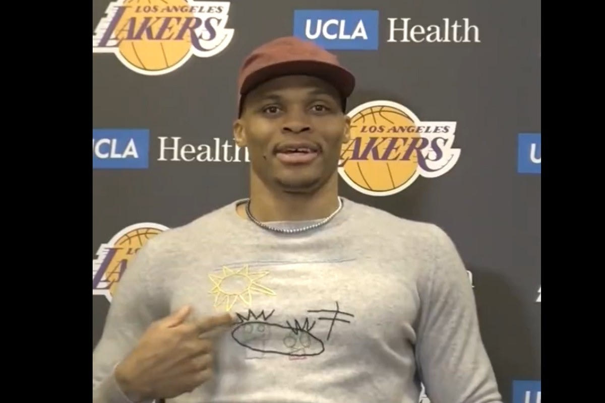 Γνωστός για τις ιδιαίτερες στιλιστικές του επιλογές, ο Ράσελ Γουέστμπρουκ έκανε πάλι την διαφορά, αφού εμφανίστηκε σε συνέντευξη Τύπου των Λέικερς με μπλούζα που του έφτιαξε ο 5χρονος γιος του για τα γενέθλιά του.