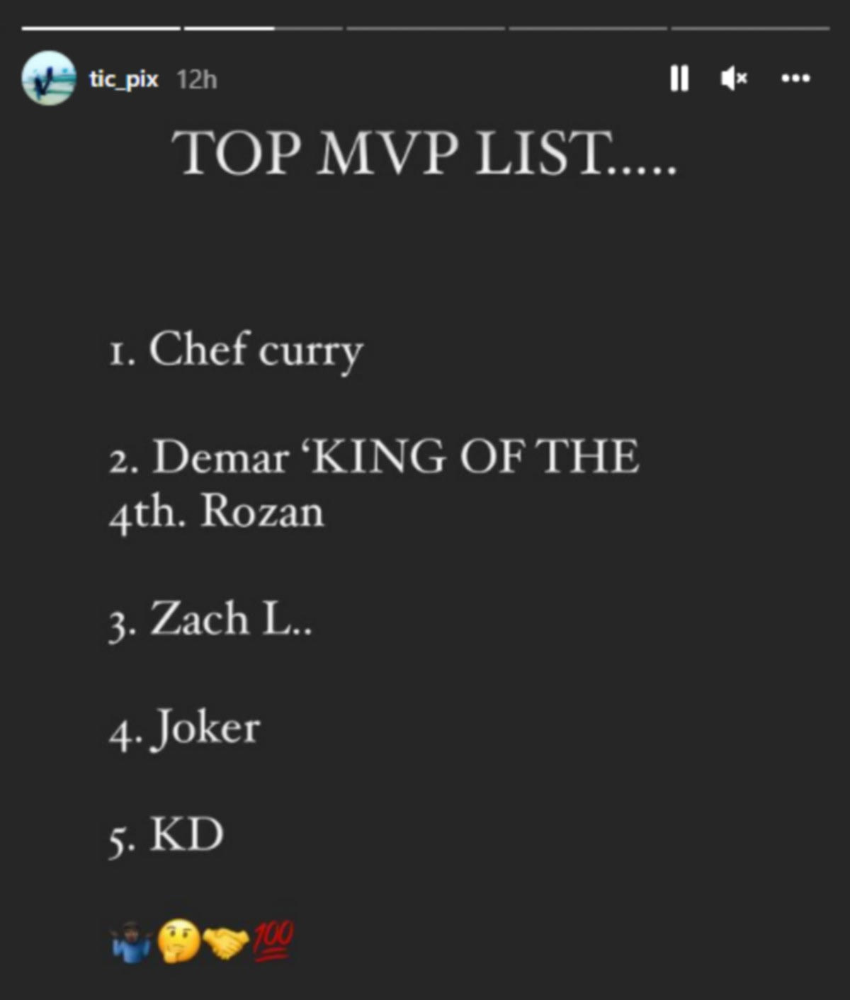 Ο παλαίμαχος ψηλός έγραψε πως ο Στεφ Κάρι είναι το φαβορί για το MVP, αυτή τη στιγμή φυσικά, με τον ΝτεΜάρ ΝτεΡόζαν, τον Ζακ ΛαΒίν, τον Νίκολα Γιόκιτς και τον Κέβιν Ντουράντ να συμπληρώνουν την πεντάδα του, από την οποία απουσιάζει ο Γιάννης Αντετοκούνμπο.