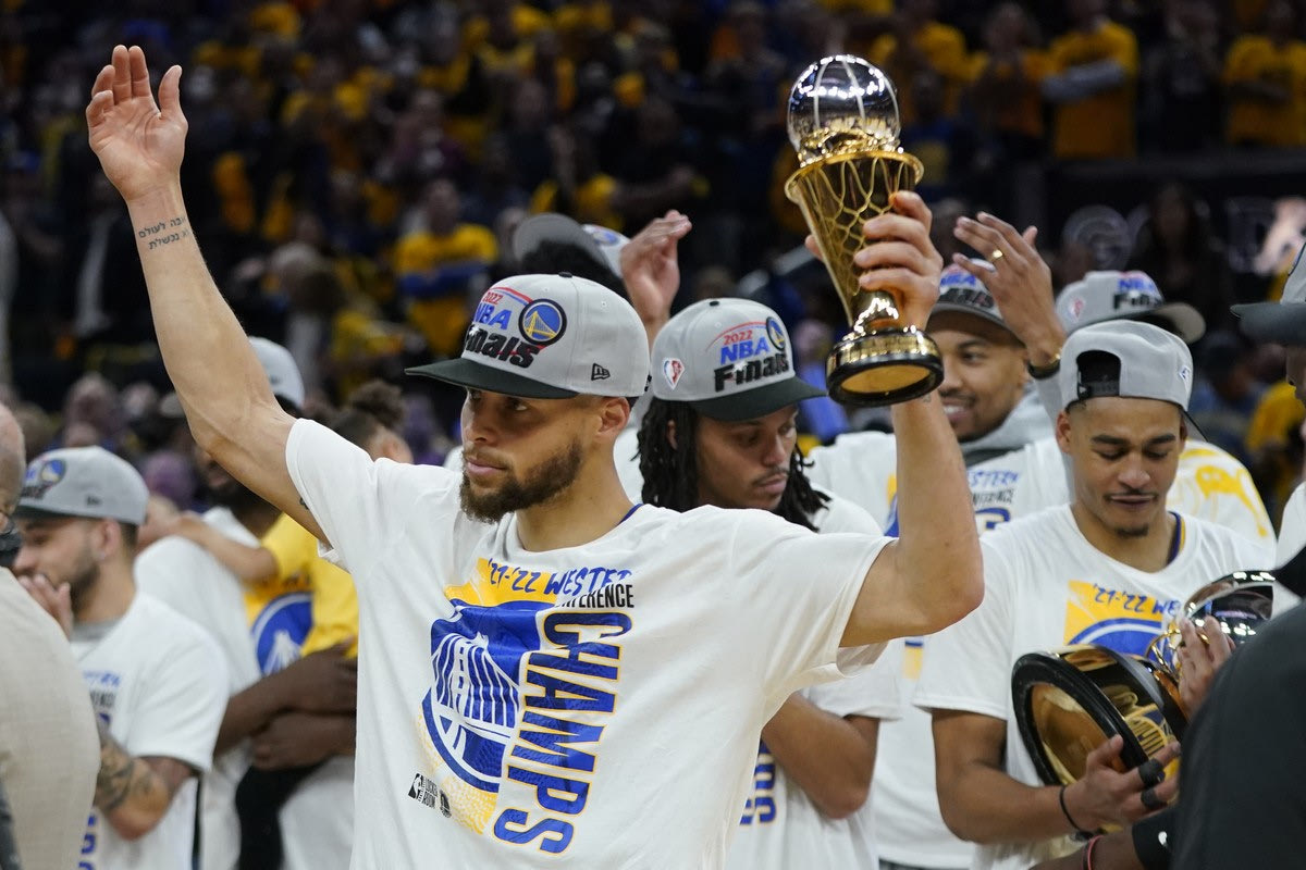 Golden State Warriors' Stephen Curry celebrates with the conference finals MVP trophy after defeating the Dallas Mavericks in Game 5 of the NBA basketball playoffs Western Conference finals in San Francisco, Thursday, May 26, 2022. (AP Photo/Jeff Chiu)