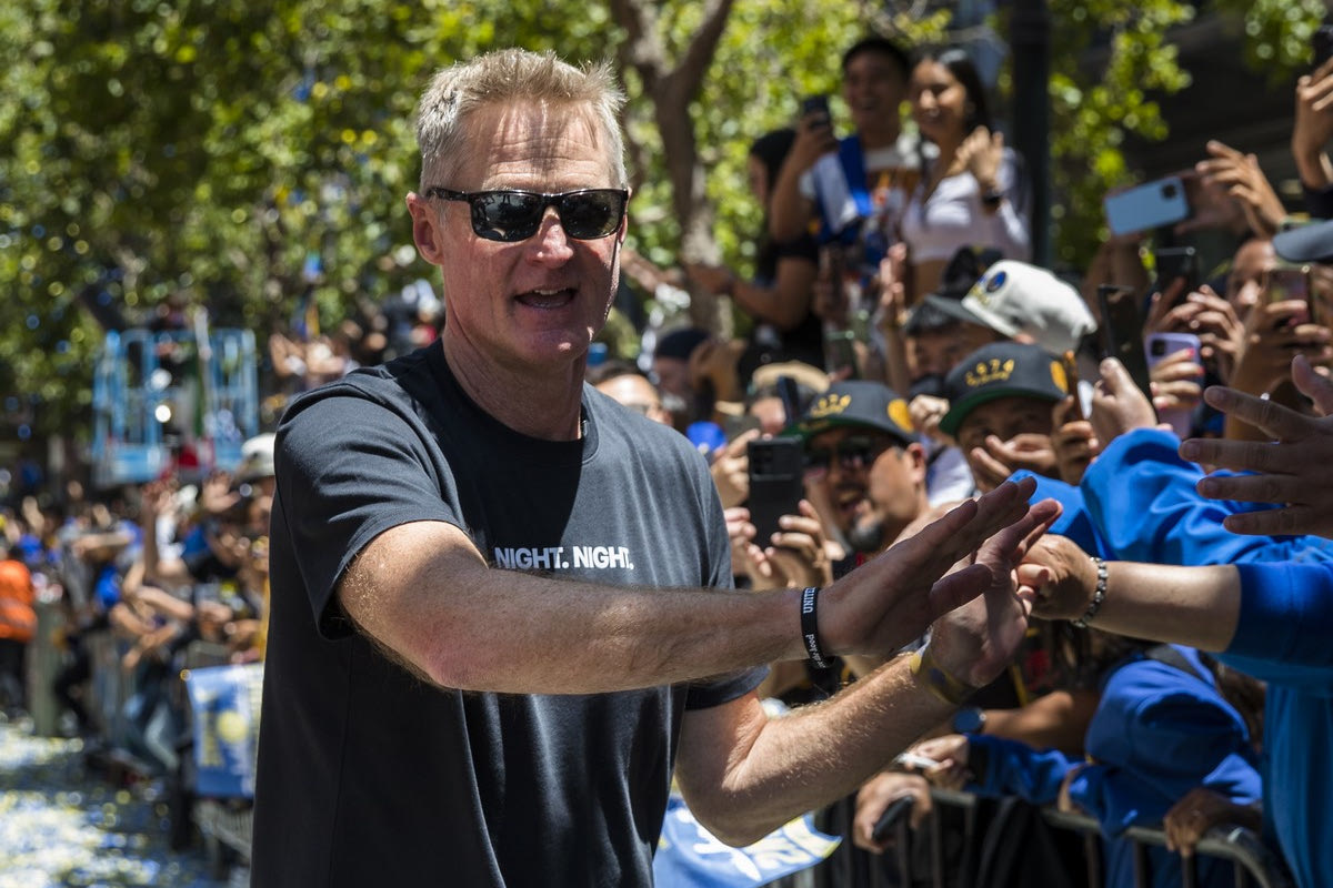 Golden State Warriors head coach Steve Kerr high-fives the crowd during the NBA Championship parade in San Francisco, Monday, June 20, 2022, in San Francisco. (AP Photo/John Hefti)