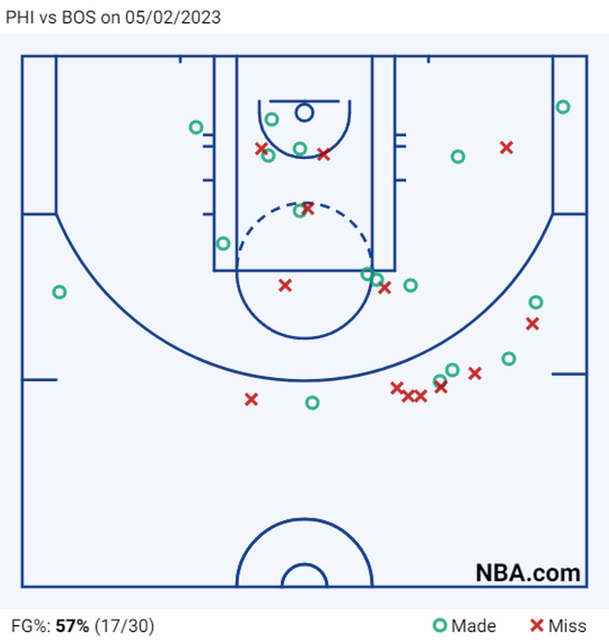 Κόντρα στους – γεμάτους ημίψηλα κορμιά και πολλούς παίκτες να ρίξουν πάνω του – Σέλτικς, ο Χάρντεν κλήθηκε για ένα παιχνίδι να κουβαλήσει τους Σίξερς όπως έκανε με τους Ρόκετς. Το usage rate του (κατοχές που ενεπλάκη άμεσα όσο ήταν στο παρκέ και τελείωσαν με σουτ του ή ασίστ του) έφτασε το 41.7%. Η 45αρα του ήρθε μέσα από 30 προσπάθειες για σουτ και μόλις 4 βολές. Έμοιαζε με τον Χάρντεν των Ρόκετς. Το Shot Chart του από τον αγώνα όμως λέει μία άλλη ιστορία: