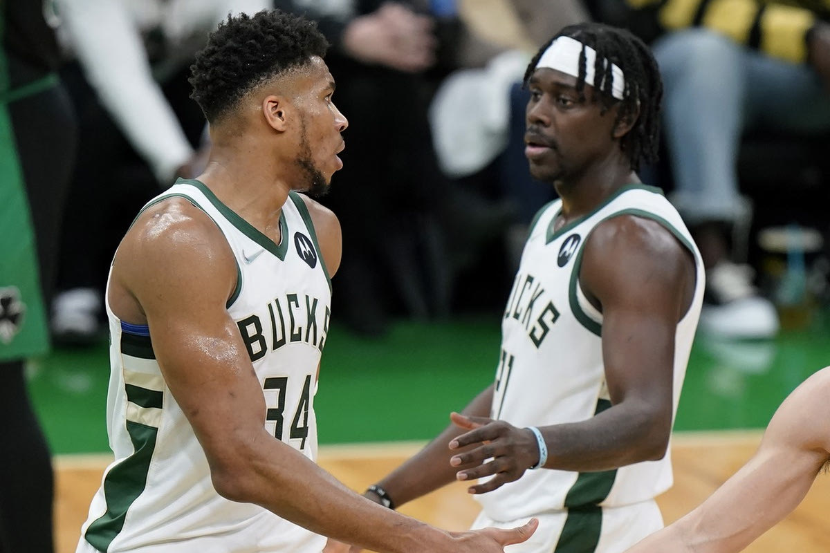 Milwaukee Bucks forward Giannis Antetokounmpo, left, of Greece, celebrates with guards Jrue Holiday, center, and Grayson Allen, right, after making a free throw in the second half of Game 1 in the second round of the NBA Eastern Conference playoff series against the Boston Celtics, Sunday, May 1, 2022, in Boston. (AP Photo/Steven Senne) 2022 AP Photo/Steven Senne