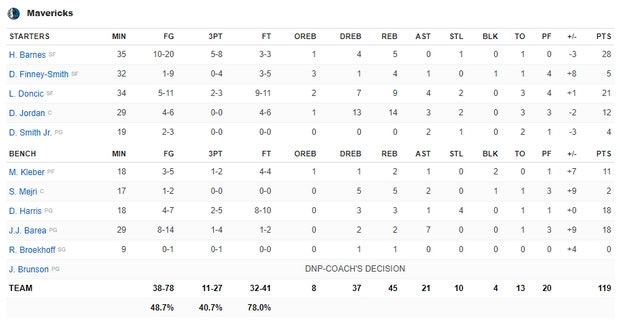 Ο Χάρισον Μπαρνς με 28 πόντους ήταν ο πρώτος σκόρερ των νικητών, με τους Ντέβιν Χάρις και Τζέι Τζέι Μπαρέα να έχουν από 18 πόντους.