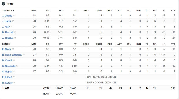 Για τους Νετς, ο Αλαν Κραμπ είχε 27 πόντους με 7/11 τρίποντα, ο Σπένσερ Ντίνγουϊντι 19 πόντους και οι Εντ Ντέιβις και Ντ’Αντζελο Ράσελ από 17 πόντους, με τον δεύτερο να έχει πάντως 6/18 σουτ.