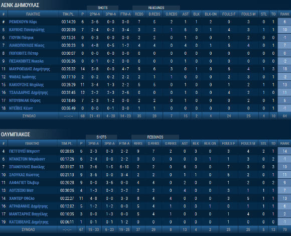 Ολυμπιακός (Τόμιτς): Πέτγουεϊ 6, Χάντερ 11, Ντάνστον 6, Σπανούλης 13 (1), Σλούκας 9, Λαφαγιέτ 9 (3), Λοτζέσκι 4, Αγραβάνης 5 (1), Μάντζαρης 3 (1), Κατσίβελης 1.