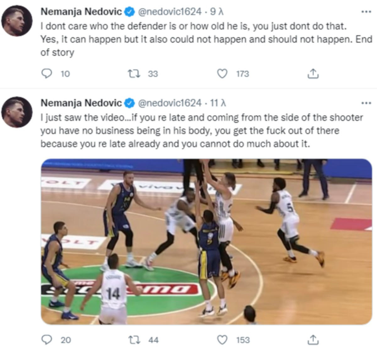 Ο γκαρντ του Παναθηναϊκού ΟΠΑΠ έγραψε χαρακτηριστικά στο Twitter: “Μόλις είδα το βίντεο. Αν έχεις αργήσει κι έρχεσαι από το πλάι στον σουτέρ, δεν έχεις καμία δουλειά να είσαι στο κορμί του, εξαφανίζεσαι από εκεί γιατί έχεις αργήσει ήδη και δεν μπορείς να κάνεις κάτι γι αυτό. Δεν με ενδιαφέρει ποιος είναι ο αμυντικός ή πόσων χρονών είναι, απλά δεν το κάνεις αυτό. Ναι, μπορεί να συμβεί αλλά μπορεί και πρέπει επίσης να μην συμβεί. Τέλος της ιστορίας“.
