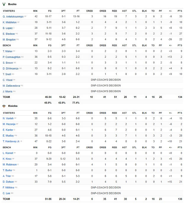 Πέρα από τον Αντετοκούνμπο, πολύ καλοί ήταν και οι Ερικ Μπλέντσο (27 πόντοι, 7 ασίστ), Μάλκολμ Μπρόγκντον (22 πόντοι) για το Μιλγουόκι. Ωστόσο οι Μπακς πέταξαν στα σκουπίδια όλες τις διψήφιες διαφορές που δημιούργησαν στο δεύτερο ημίχρονο (και ήταν πολλές), καθώς και τις τρεις ευκαιρίες που είχαν για να πάρουν τη νίκη στην κανονική διάρκεια και στην παράταση ενός αγώνα που φάνηκε από το ξεκίνημα ότι θα είχε πολλές συγκινήσεις να προσφέρει.