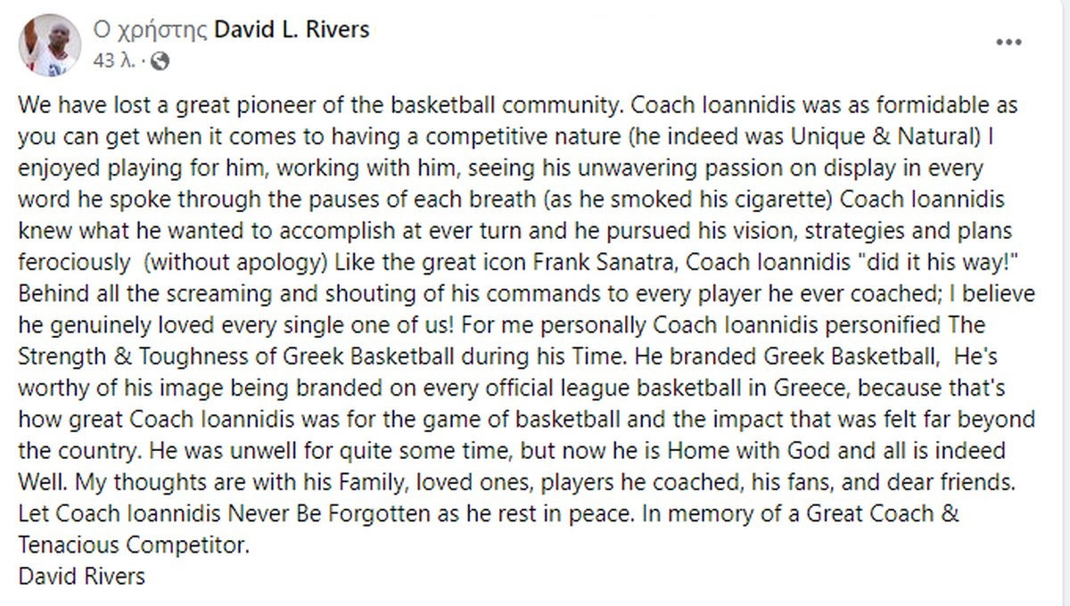 Ο σπουδαίος Γιάννης Ιωαννίδης έφυγε από την ζωή και ο ένας μετά τον άλλο οι παίκτες που αγωνίστηκαν για αυτόν (ή και εναντίον του) και οι προπονητές που βρέθηκαν απέναντί του τον αποθέωσαν. Το ίδιο έκανε και ο Ντέιβιντ Ρίβερς.