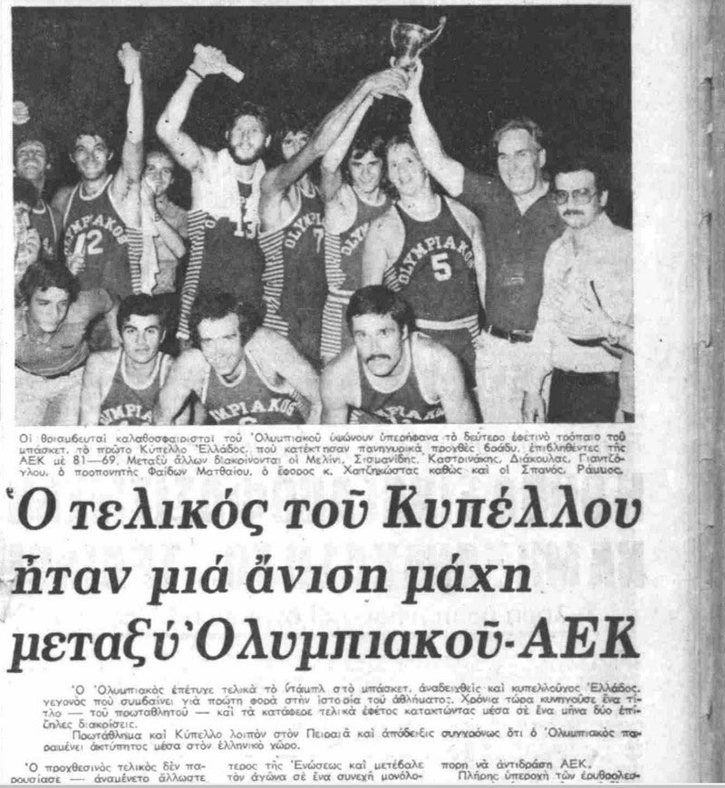 Στις 12 Ιουλίου 1976, στο κλειστό γήπεδο της Γλυφάδας, ο Ολυμπιακός νικούσε 81-69 την ΑΕΚ και κατακτούσε το Κύπελλο, που είχε καθιερώσει -για πρώτη φορά- η ομοσπονδία μπάσκετ.