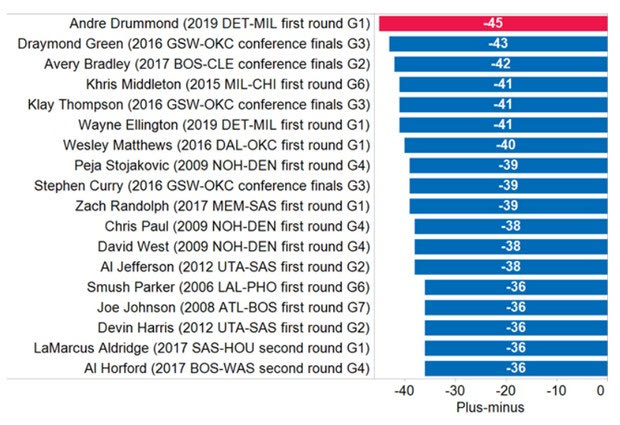 Συγκεκριμένα, ο πληθωρικός σέντερ των Πίστονς έγραψε το ασυναγώνιστο -45 στην κατηγορία +/-, το οποίο είναι το χειρότερο όλων των εποχών σε αγώνα postseason. Στα 26:16 που έμεινε ο Ντράμοντ στο παρκέ οι Πίστονς έχασαν με διαφορά 45 πόντων, επίδοση που δεν θα προκαλέσει εντύπωση αν ξεπεραστεί σε επόμενο αγώνα της σειράς.