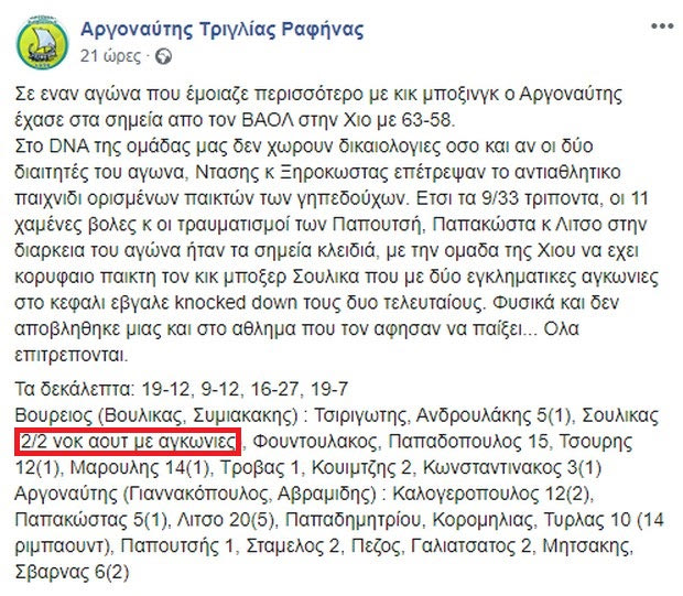 ” Σε εναν αγώνα που έμοιαζε περισσότερο με κικ μποξινγκ, ο Αργοναύτης έχασε στα σημεία απο τον ΒΑΟΛ στην Χιο με 63-58. Στο DNA της ομάδας μας δεν χωρουν δικαιολογίες οσο και αν οι δύο διαιτητές του αγώνα, Ντάσης κ Ξηροκώστας επέτρεψαν το αντιαθλητικο παιχνιδι ορισμένων παικτών των γηπεδούχων. Ετσι τα 9/33 τριποντα, οι 11 χαμένες βολές κ οι τραυματισμοί των Παπουτσή, Παπακώστα κ Λίτσο στην διάρκεια του αγώνα ήταν τα σημεία κλειδιά, με την ομάδα της Χίου να εχει κορυφαίο παίκτη τον κικ μποξερ Σουλίκα που με δύο εγκληματικές αγκωνιές στο κεφάλι εβγαλε knocked down τους δυο τελευταίους. Φυσικά και δεν αποβλήθηκε μιας και στο άθλημα που τον άφησαν να παίξει… όλα επιτρέπονται“, αναφέρεται στη δημοσίευση της ομάδας στη σελίδα της στο Facebook, όπως βλέπετε και στην εικόνα με το ιδιαίτερο στατιστικό.