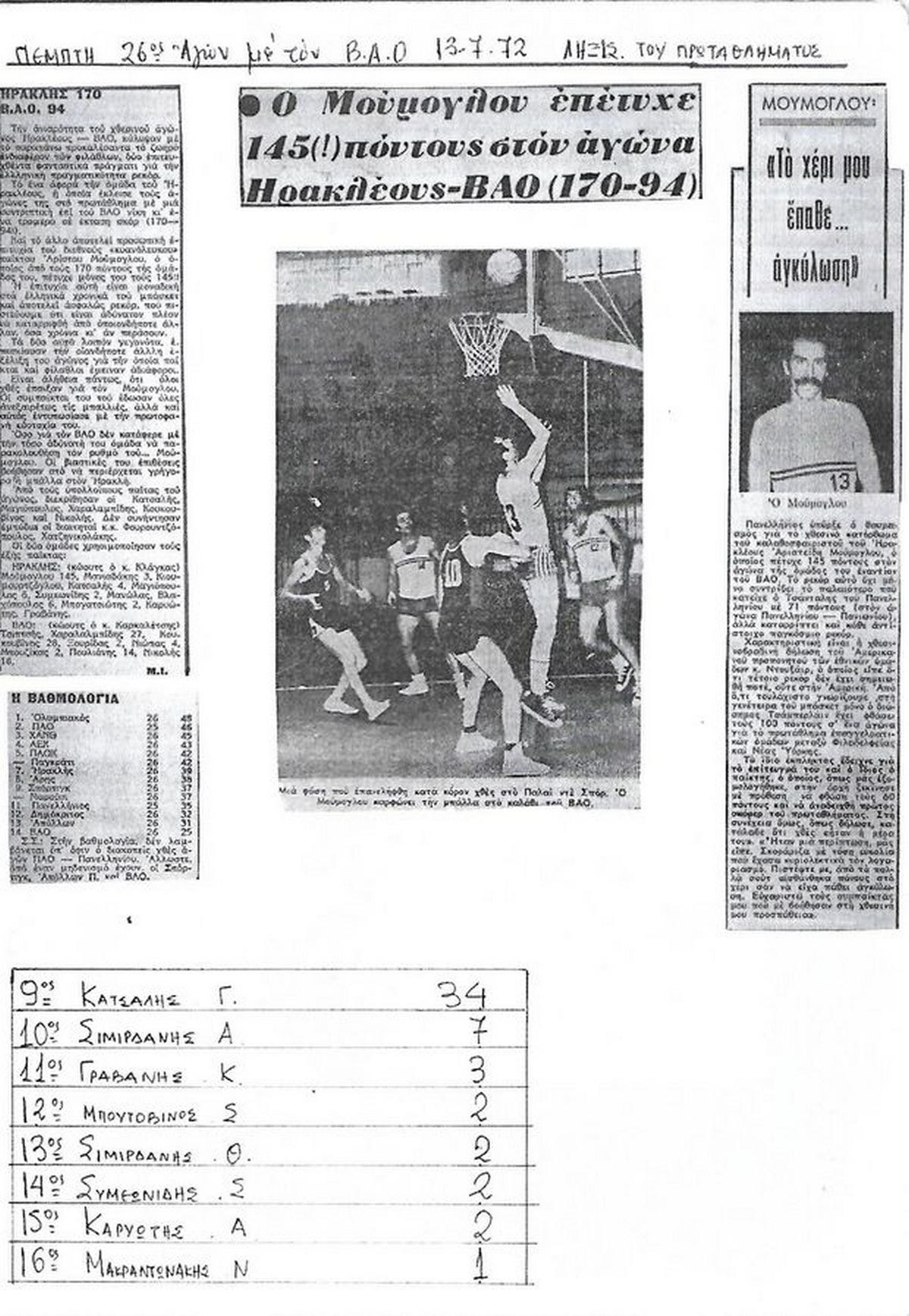 Το ημερολόγιο γράφει 13 Ιουλίου του 1972. Ο Ηρακλής υποδέχεται στο Παλέ ντε Σπορ τον ΒΑΟ για την τελευταία αγωνιστική του Πρωταθλήματος Θεσσαλονίκης. Το ματς μπορεί να μην έχει βαθμολογική σημασία, ωστόσο όλοι στην Γηραιό το περιμένουν πώς και πώς. Πρώτος και καλύτερος ο Αριστείδης Μούμογλου, ο ηγέτης του Ηρακλή και ένας από τους μεγαλύτερους σκόρερ της εποχής.